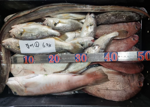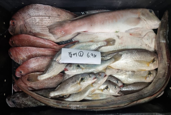 (판매완료) 잡어1(백조기15,참돔5,우럭1,가자미1,옥돔,갯장어 -6.9kg) 40,000원