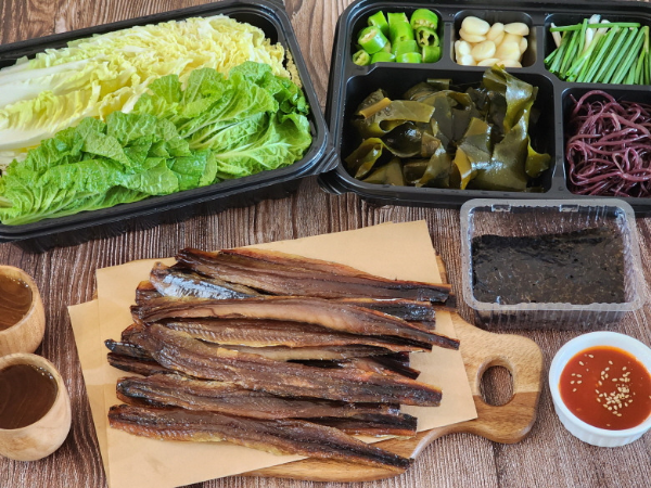 ※ 중량/ 사이즈 : 꽁치 과메기 10쪽(5미) 160g 내외 / 김 10g / 초장 150g