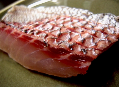마스까와란? 돔 껍질을 위로 놓고 끓는 물을 부어서 껍질만 살짝 익히고 바로 얼음물에 넣어 식혀주는 작업입니다 돔 껍질과 살 사이에 지방이 많기 때문에 이러한 작업을 하면 더욱 맛있어지죠. 뜨거운 물을 부어주면 돔 껍질이 소나무 껍질처럼 아름다운 문양으로 피어나기에 마스까와라고 합니다. 도미 뿐 아니라 농어도 이런 작업을 거치면 더 풍부한 맛을 즐길 수 있습니다.