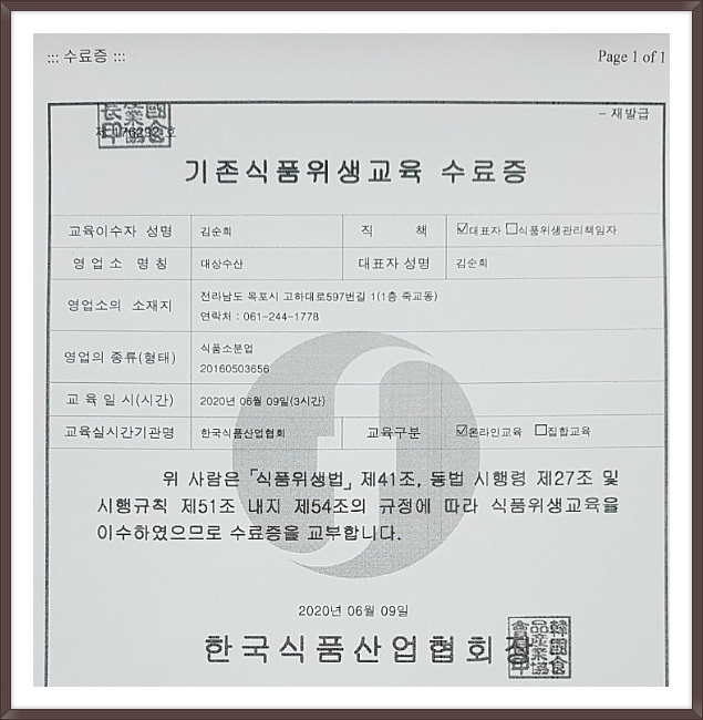 젓갈류를 소분하여 판매할때는 1년에 한번씩 인터넷으로 강의를 받고 시험을 치룬 후 소분업 허가증을 재발행해줍니다. 2020년 허가증이에요~~ 새우젓 용기와 박스는 주문 제작하여 사용하고 있습니다. 깔끔한 새우젓 포장으로 받으실 수 있습니다.