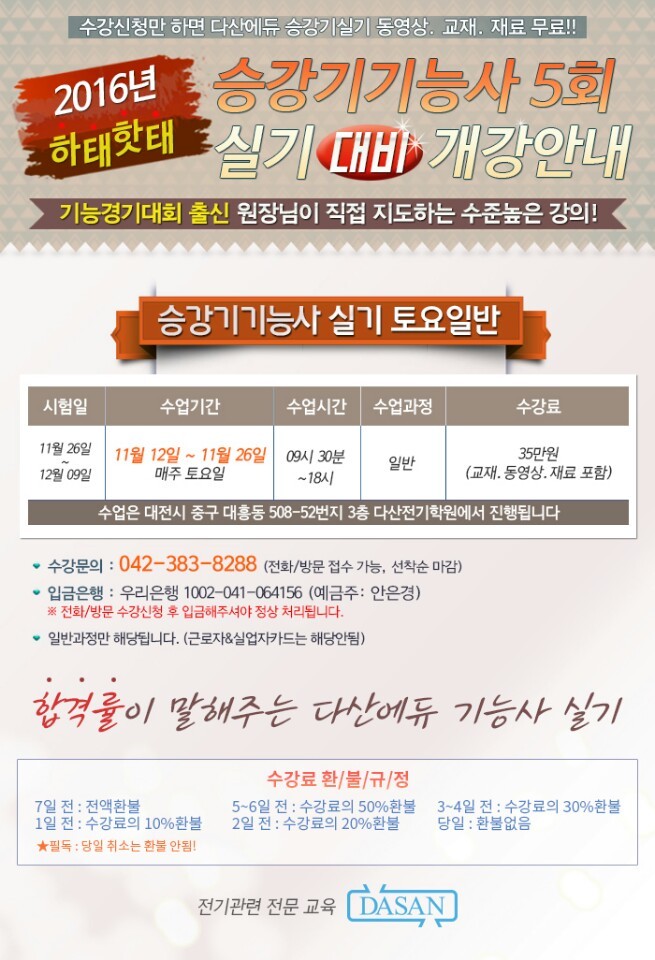 [5회 승강기기능사 실기반 모집] 다산전기학원-주말반 작성자프롬|작성시간16.09.06|조회수384 목록 댓글 0 글자크기 작게가 글자크기 크게가 다산전기학원은 아래와 같이 수강생을 모집합니다.많은 사랑과 관심부탁드리고, 궁금한것은 언제든지 전화주시기 바랍니다. 다음검색 현재 게시글 추가 기능 열기 북마크 공유하기 신고 센터로 신고 댓글 댓글 0 댓글쓰기 답글쓰기 댓글 리스트
