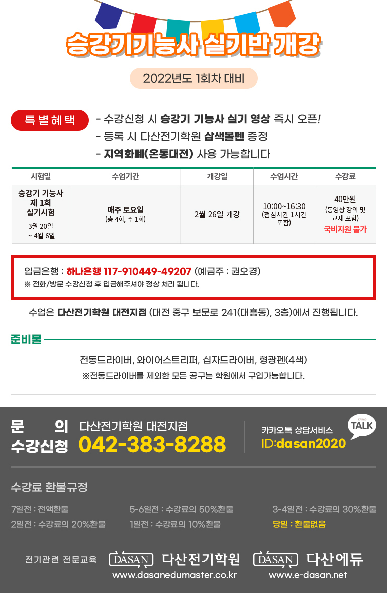| 안녕하세요 대전다산전기학원입니다 2022년 제1회 승강기기능사실기(정규반) 모집공고 안내드리오니 필기시험 합격후 실기는 다산전기학원에서 준비 하시기 바랍니다^^ 감사합니다. '' 수강등록시 승강기기능사실기 동영상 즉시오픈 '' 새로운유형(공개문제) 완벽해설 및 작업 원장 시연 '' 수험생 개개인 역량에따른 맞춤지도(정말 꼼꼼하고 알기쉽게 알려드립니다) '' 충분한 재료 및 연습시간 제공급 |