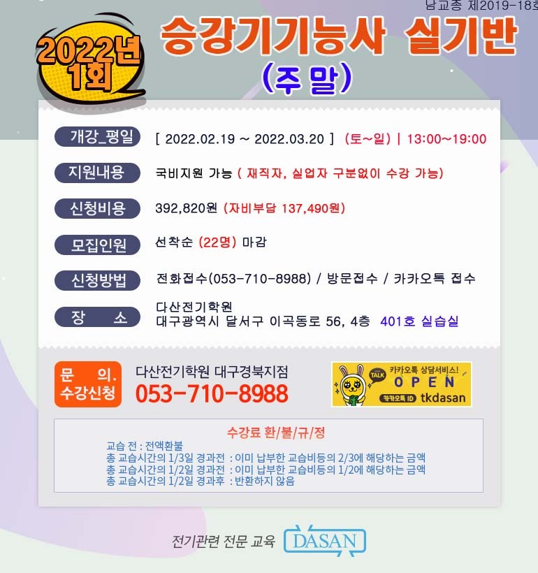 [다산전기학원 대구경북지점] 국비_승강기기능사실기_2022.02.19-2022.03.20 작성자다산 장원식원장|작성시간22.01.21|조회수132 목록 댓글 0 글자크기 작게가 글자크기 크게가 다음검색 현재 게시글 추가 기능 열기 북마크 공유하기 신고 센터로 신고 댓글 댓글 0 댓글쓰기 답글쓰기 댓글 리스트