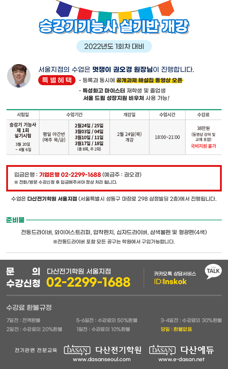 | [특성화고/마이스터고 바우처 사용가능] 안녕하세요 멋쟁이 권오경원장입니다. 평일[야간반] 승강기기능사실기 대비반을 모집합니다. 매주 [목/금] 시간 : 18시~21시 (일일 3시간) 02월24일 18시 개강 [일자] 2월24일/25일 3월03일/04일 3월10일/11일 3월17일/18일 등록과 동시에 승강기기능사 공개과제 영상이 오픈됩니다. ^^ 많은 등록 부탁드려요 감사합니다. |