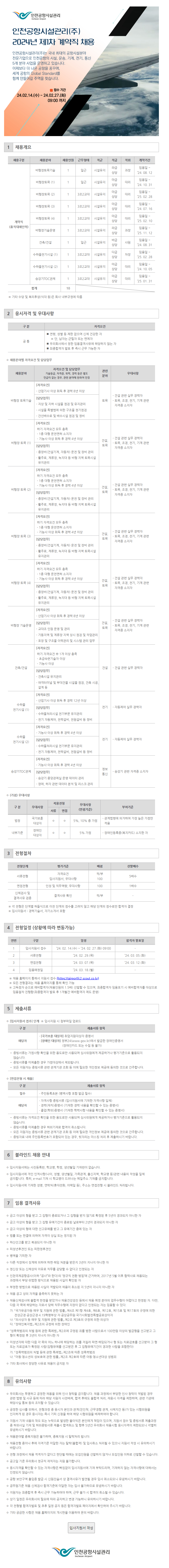 [인천공항시설관리(주)] 2024년 제1차 계약직 채용 (~2/27) 작성자스카우트 채용담당자|작성시간24.02.22|조회수18 목록 댓글 0 글자크기 작게가 글자크기 크게가 다음검색 현재 게시글 추가 기능 열기 북마크 공유하기 신고 센터로 신고 댓글 댓글 0 댓글쓰기 답글쓰기 댓글 리스트