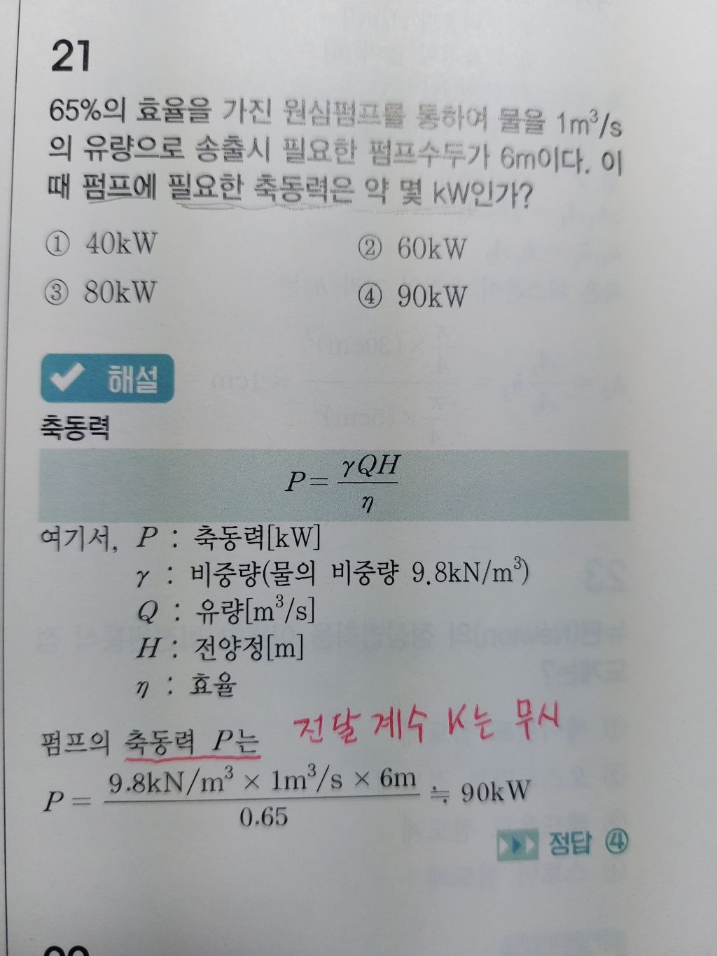 축동력 공식 질문 작성자10번|작성시간24.01.03|조회수540 목록 댓글 1 글자크기 작게가 글자크기 크게가 다른 자격증 책에는 축동력 구할때 분모에 102가 붙던데 소방 자격증 책에는 102가 없네요? 궁금증을 해결해주세요~ 다음검색 현재 게시글 추가 기능 열기 북마크 공유하기 신고 센터로 신고 댓글 댓글 1 댓글쓰기 답글쓰기 댓글 리스트 작성자소방담당교수 | 작성시간 24.01.03 비중량의 단위에 차이가 있습니다.분모에 102가 있을 경우에는 물의 비중량이 1000kgf/m^3이고 분모에 102가 없을 경우에는 물의 비중량이 9.8N/m^3입니다.1000을 102로 나누면 대략 9.8정도가 나옵니다. 댓글 전체보기