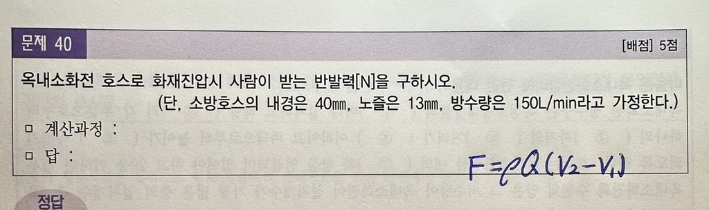 교수님 질문요 작성자윌리왕카|작성시간24.06.10|조회수118 목록 댓글 1 글자크기 작게가 글자크기 크게가 두문제 똑 같이 호스에 걸리는 반발력 문제인데 적용하는 공식이 다름 이유가 궁금해요 다음검색 현재 게시글 추가 기능 열기 북마크 공유하기 신고 센터로 신고 댓글 댓글 1 댓글쓰기 답글쓰기 댓글 리스트 작성자소방담당교수 | 작성시간 24.06.11 안녕하세요. 회원님.개정되기 전 교재를 갖고 계신 것 같습니다.두번째 문제는 아래와 같이 계산하시면 됩니다. 이미지 확대 댓글 전체보기