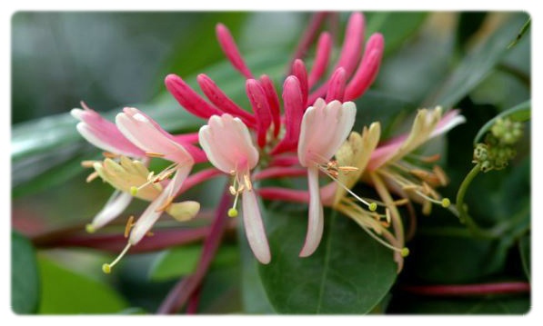 붉은 인동의 꽃말은 사랑의 인연, 헌신적인 사랑을 의미합니다. 방향이 아는 우아한 꽃으로, 마치 연인에게 기대고 있는 모습처럼 보여 사랑과 관계된 꽃말이 생겨났다고 합니다.