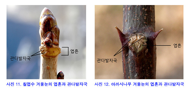 사진 겨울나기 11 칠엽수 겨울눈의 엽흔과 관다발자국 12 아카시아 겨울눈의 엽흔과 관다발자국