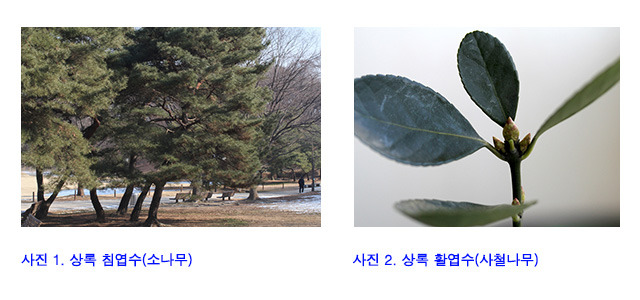 사진 겨울나기 1 상록 침엽수(소나무) 2 상록 활엽수(사철나무)