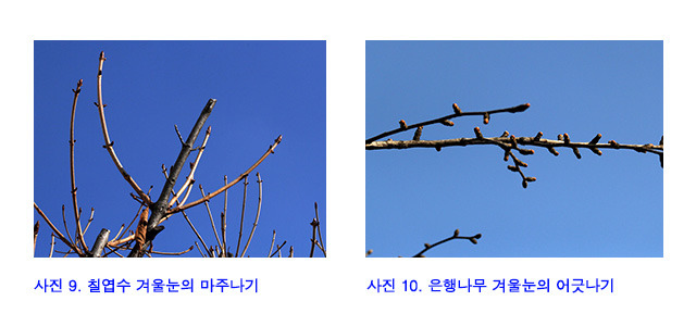 사진 겨울나기 9 칠엽수 겨울눈의 마주나기 10 은행나무 겨울눈의 어긋나기