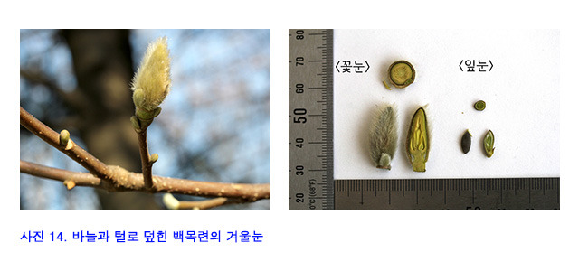 또한 나무의 겨울눈은 잎이나 꽃으로 될 새싹을 보호합니다. 겨울눈은 비늘, 솜털, 또는 진액 등으로 덮어 있어 추위를 견딜 수 있습니다(사진 13, 14, 15).