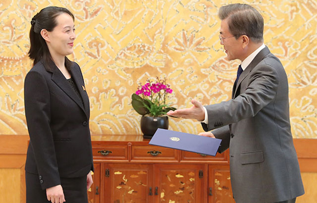 김여정과 청와대에서 만나는 문재인 대통령. ⓒ연합뉴스.