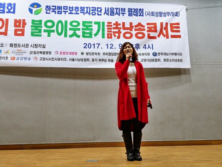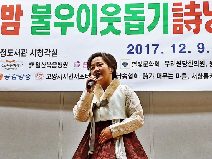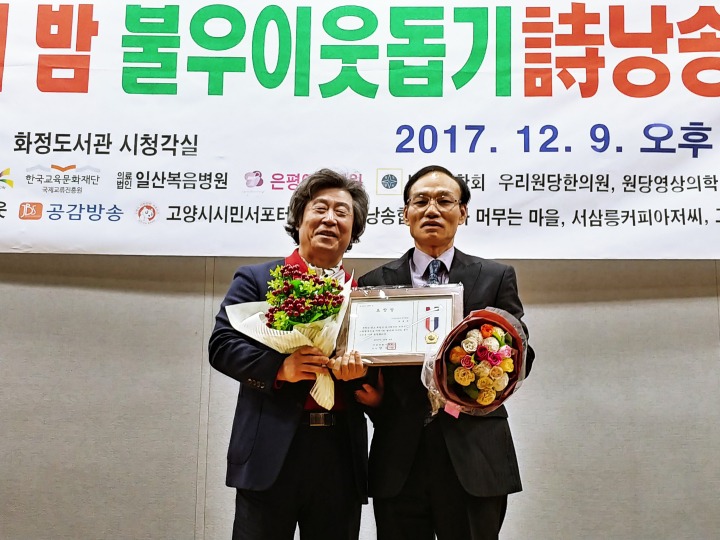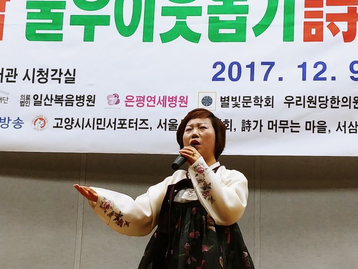 사회로 류시호 중부일보 칼럼리스트의 시낭송과 황수희 시인의 모노드라마"무정리 미용실 황원장"와 박성락 선생의 "갈보리의 노래"퍼포먼스는 또 다른 감동을 주었고 배미영 동분선 이연주 서영복 이현옥 맑은소리낭송회 회장은 제주도 여행지에서 바로 달려와 시낭송으로 재능기부를 해주었고 경향각처에서 마음으로 생계를 뒤로하고 달려와 준 문학인들의 축제와 잔치가 되었다.