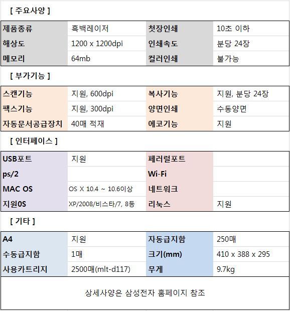 토너는 2500매 용량의 MLT-D117이 장착되며, 가격대비 출력매수가 많고,