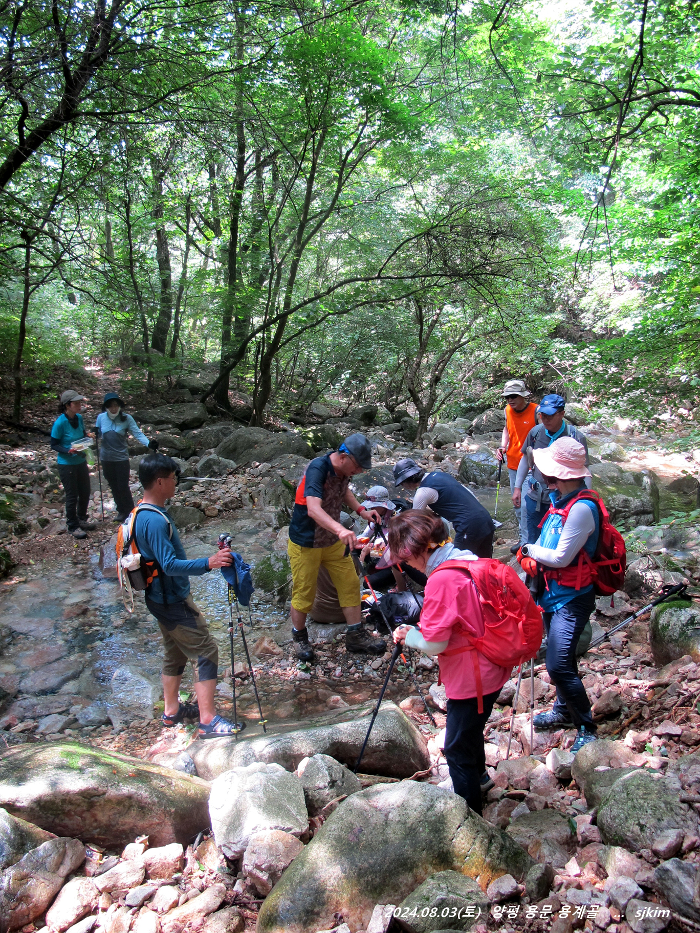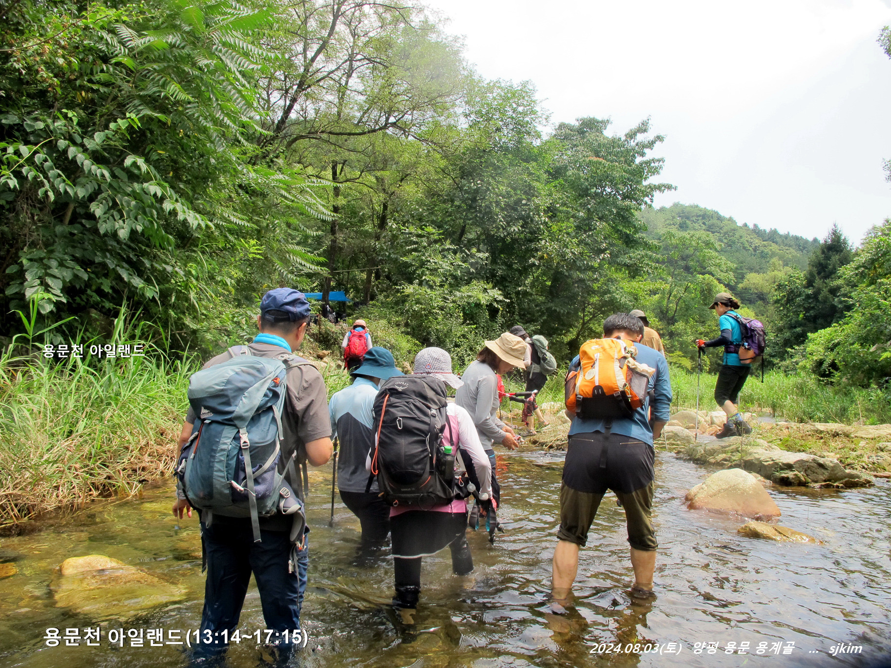 더운 나날이기에 산행은 아예 건너뛰고 짧은 물길 트레킹과 물가 자리에서 여름 향연을 펼치기로 합니다.
