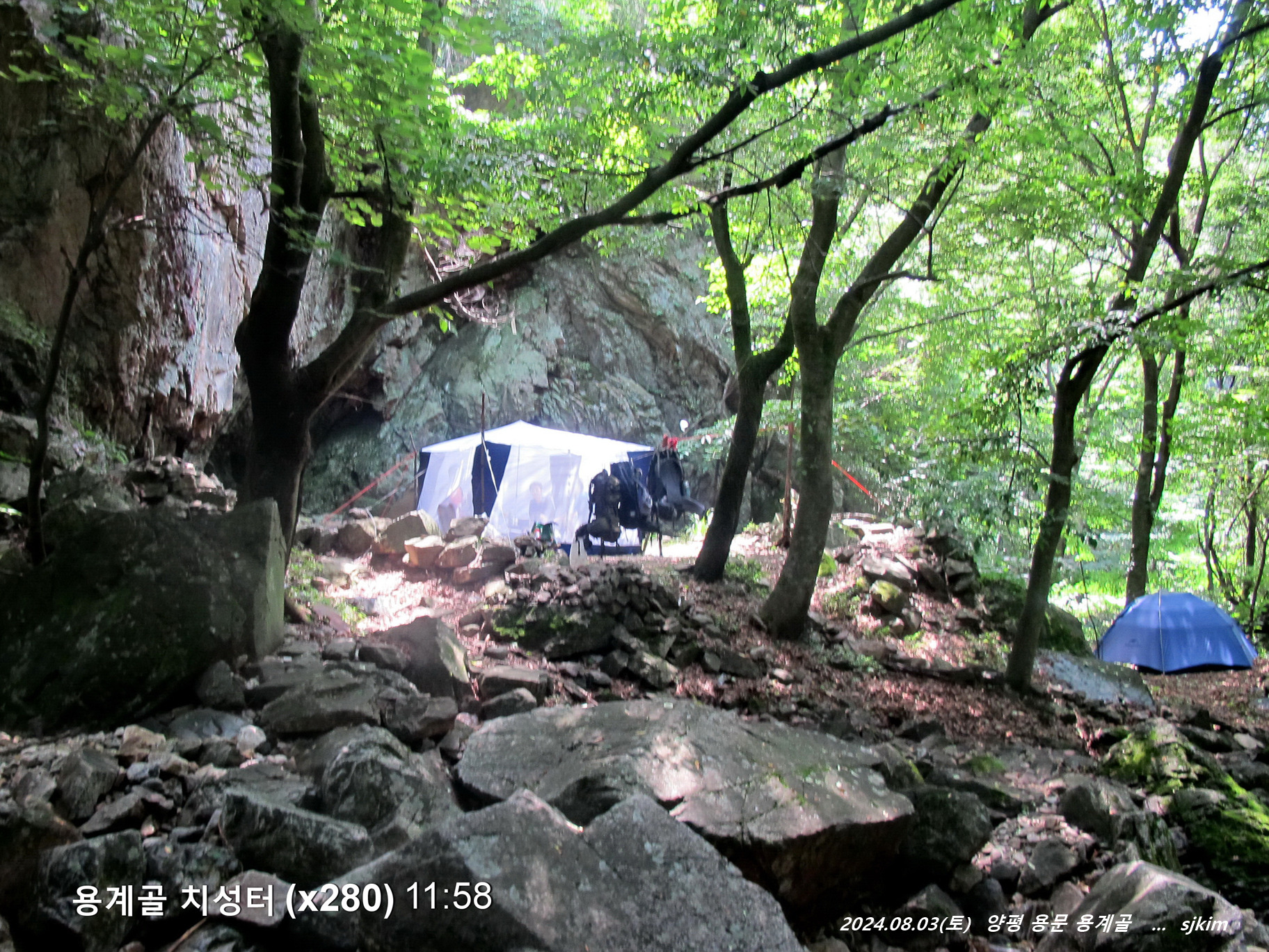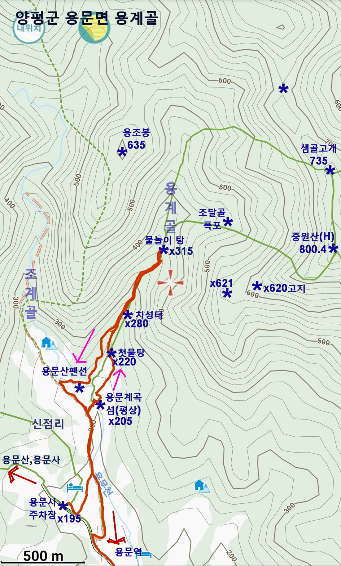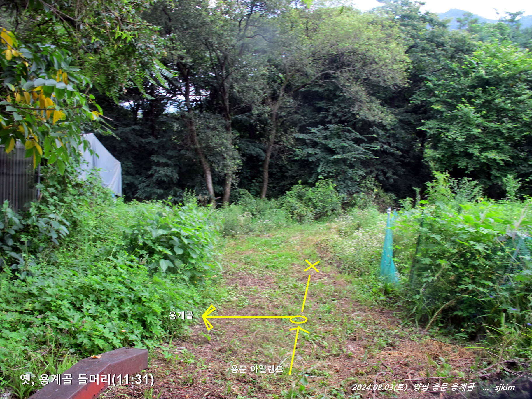 - 치성터(X280 ,11:57)- 물놀이 탕(x315, 12:11~35)- 조계골 날머리(13:08)- 용문천 아일랜드(13:15~17:15)- 용문역