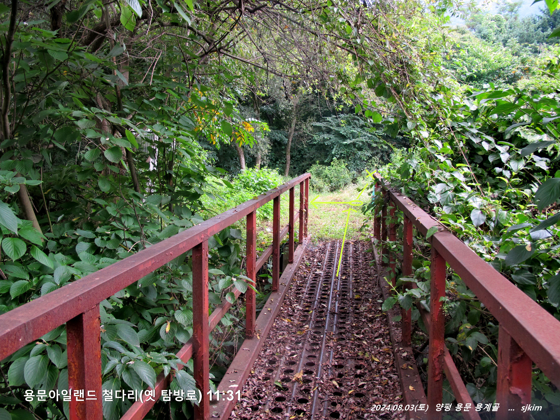 계곡 탐방 팀은 경장으로 철 난간 다리를 건너 용계골 옛길(다리 철거 후 탐방로 폐쇄)을 진행하여