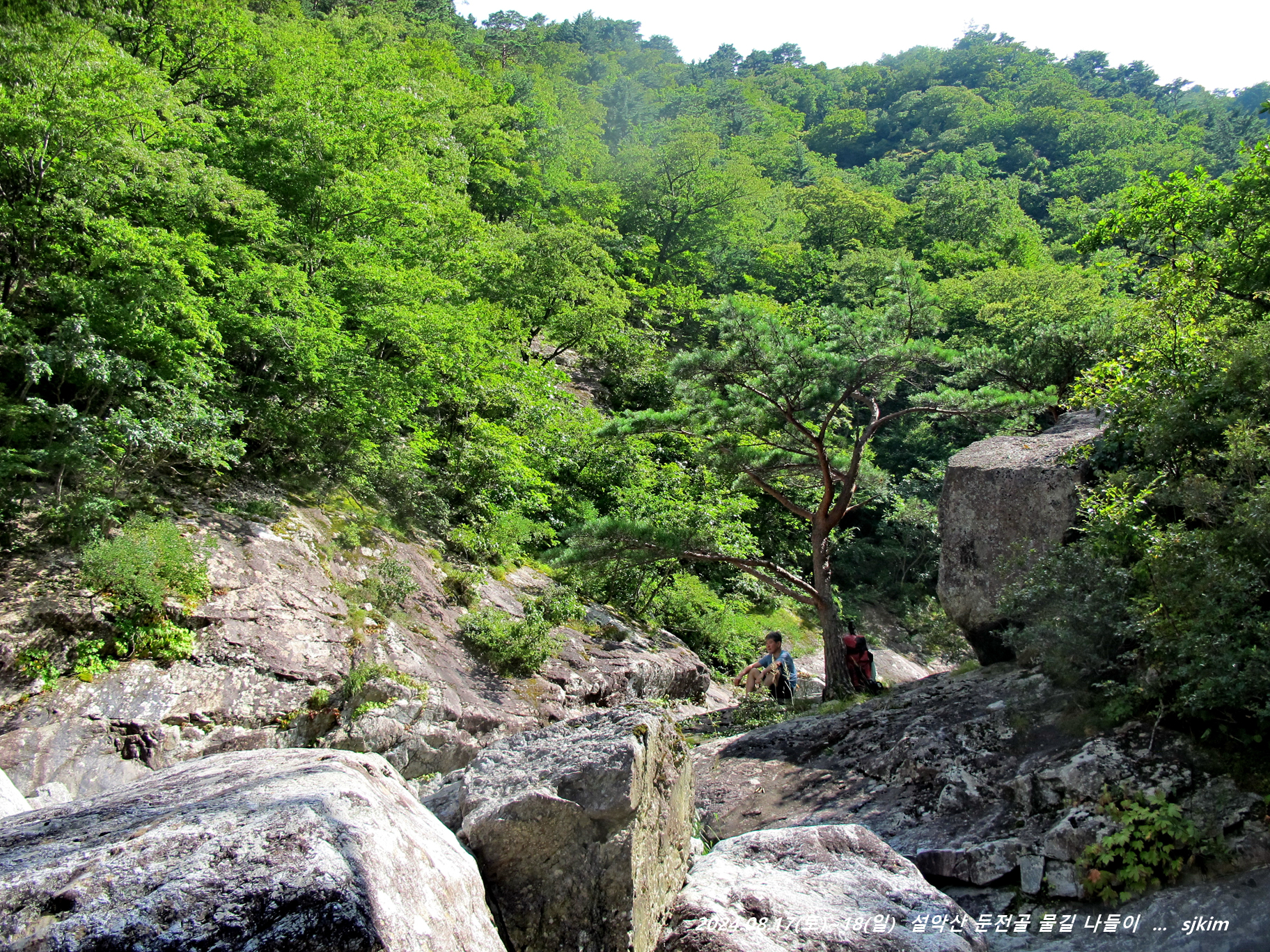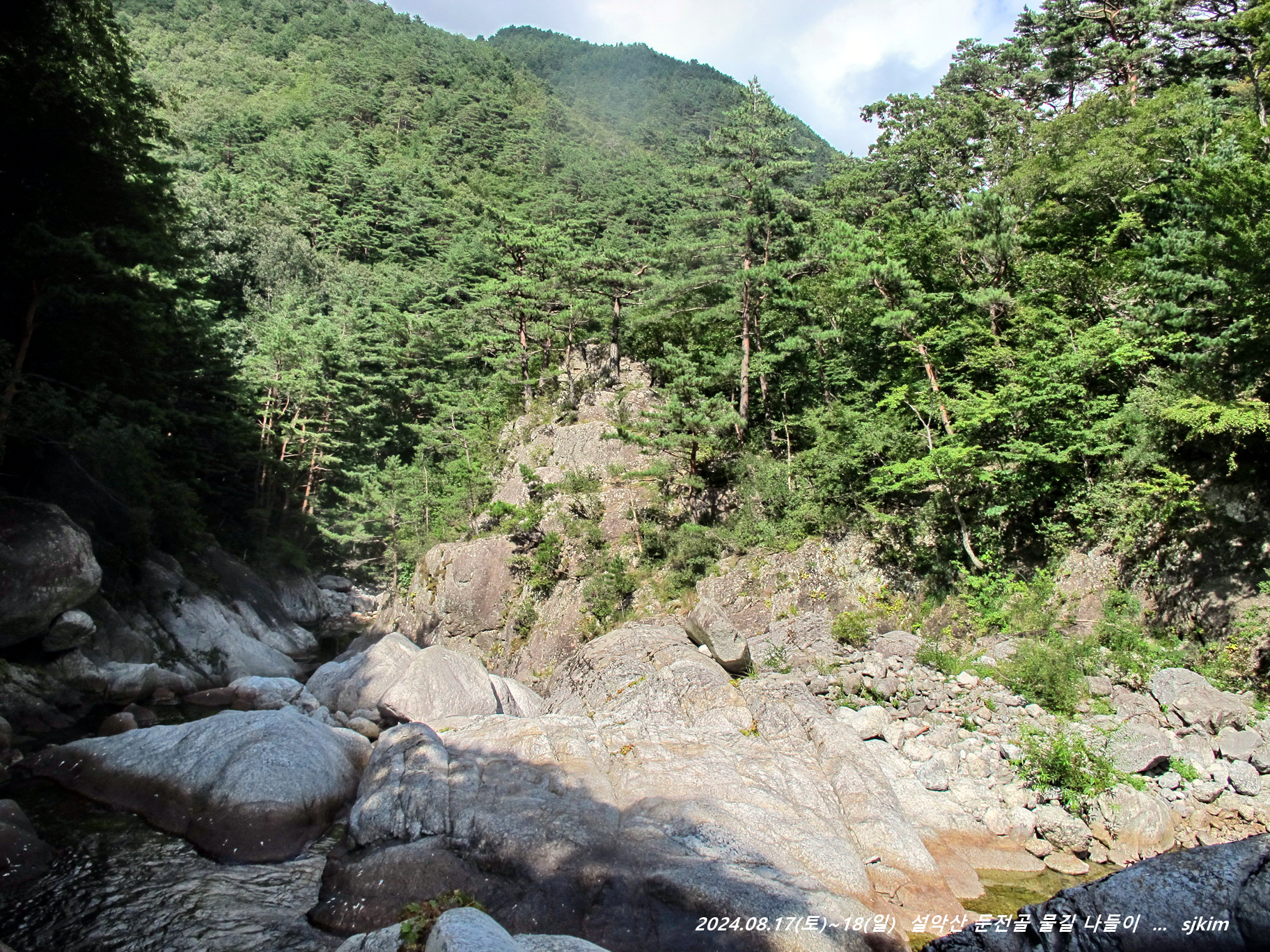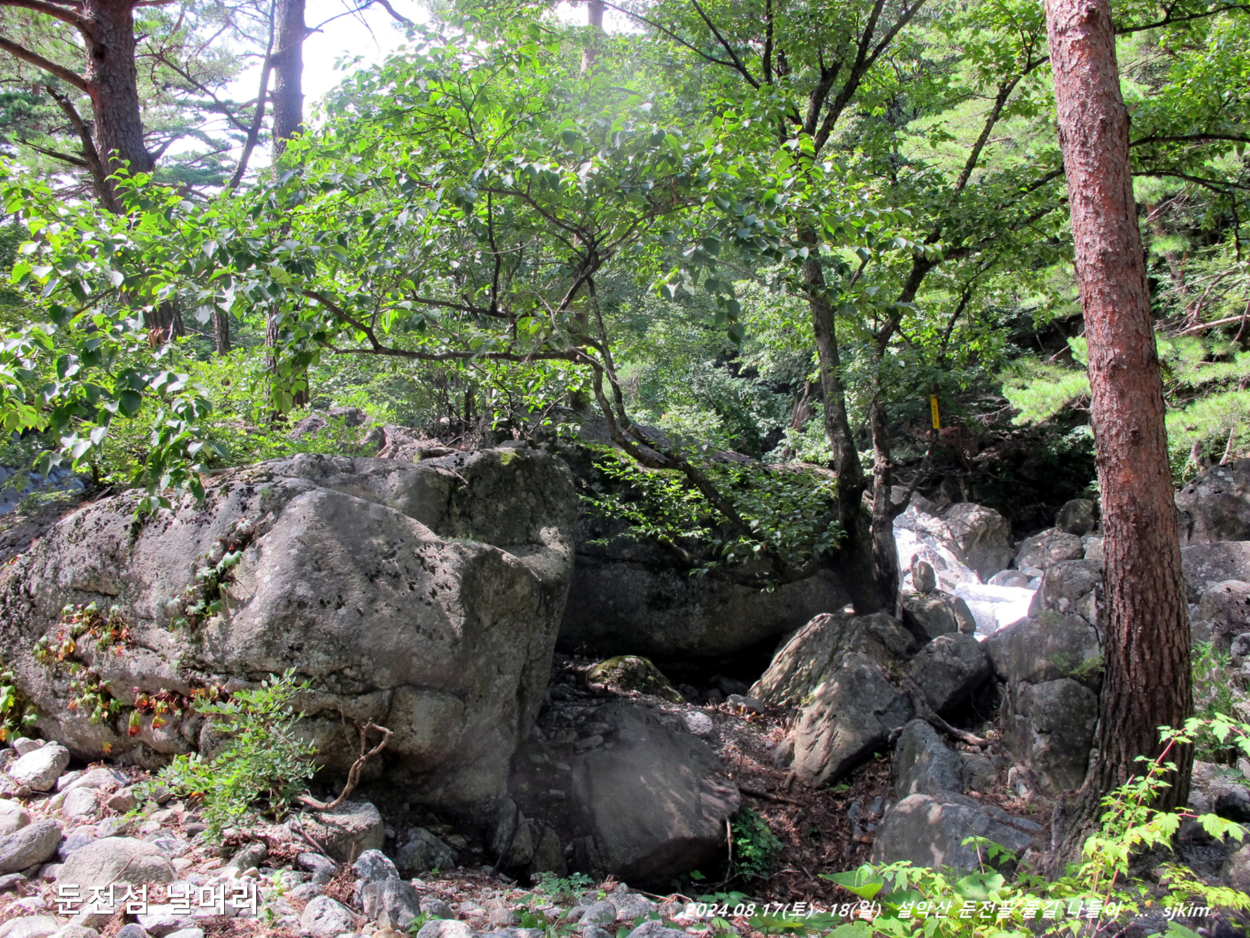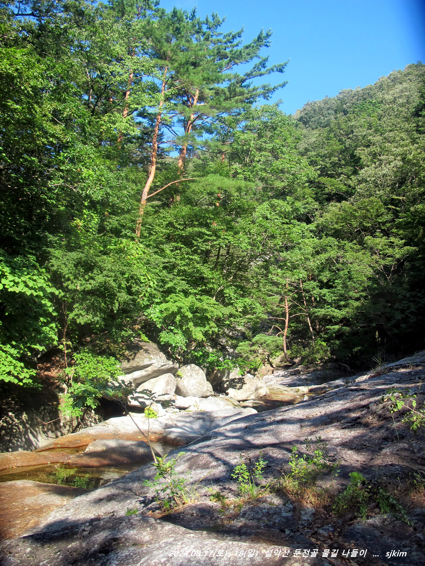 물소리 울리는 통 암반 계류, 반석과 소나무 그늘 좋은 신선대. 14:58