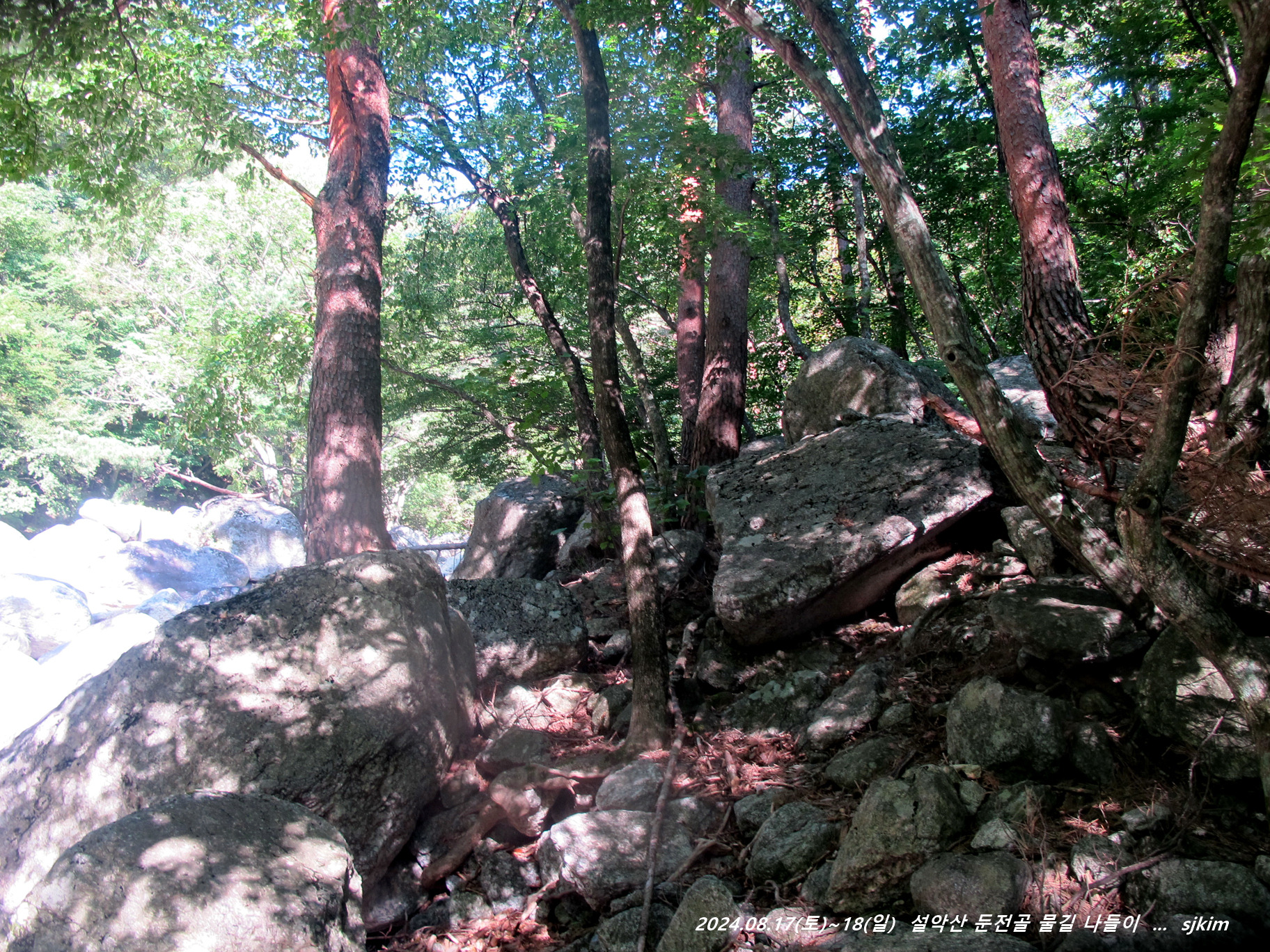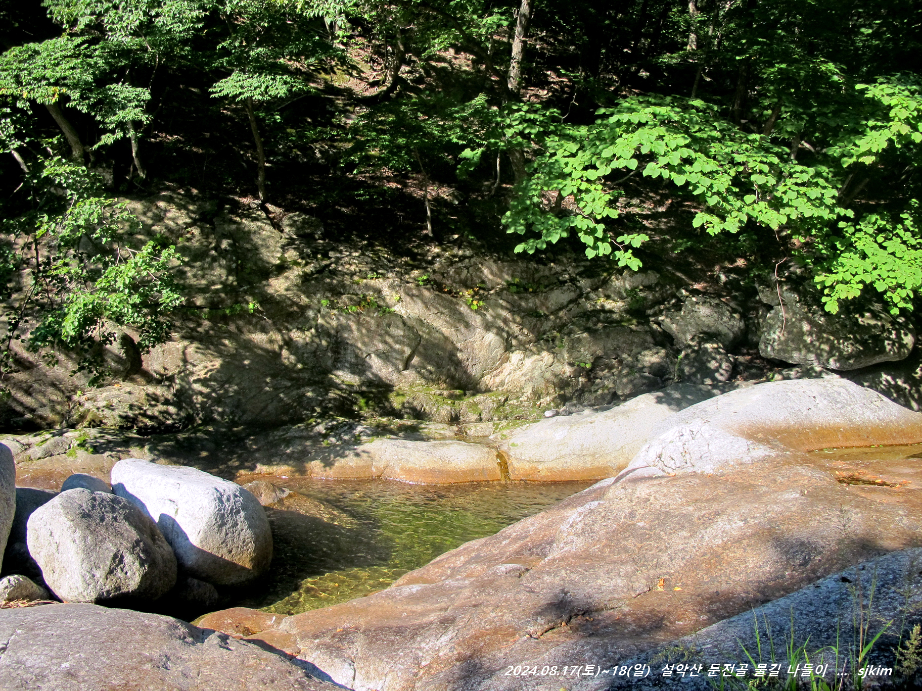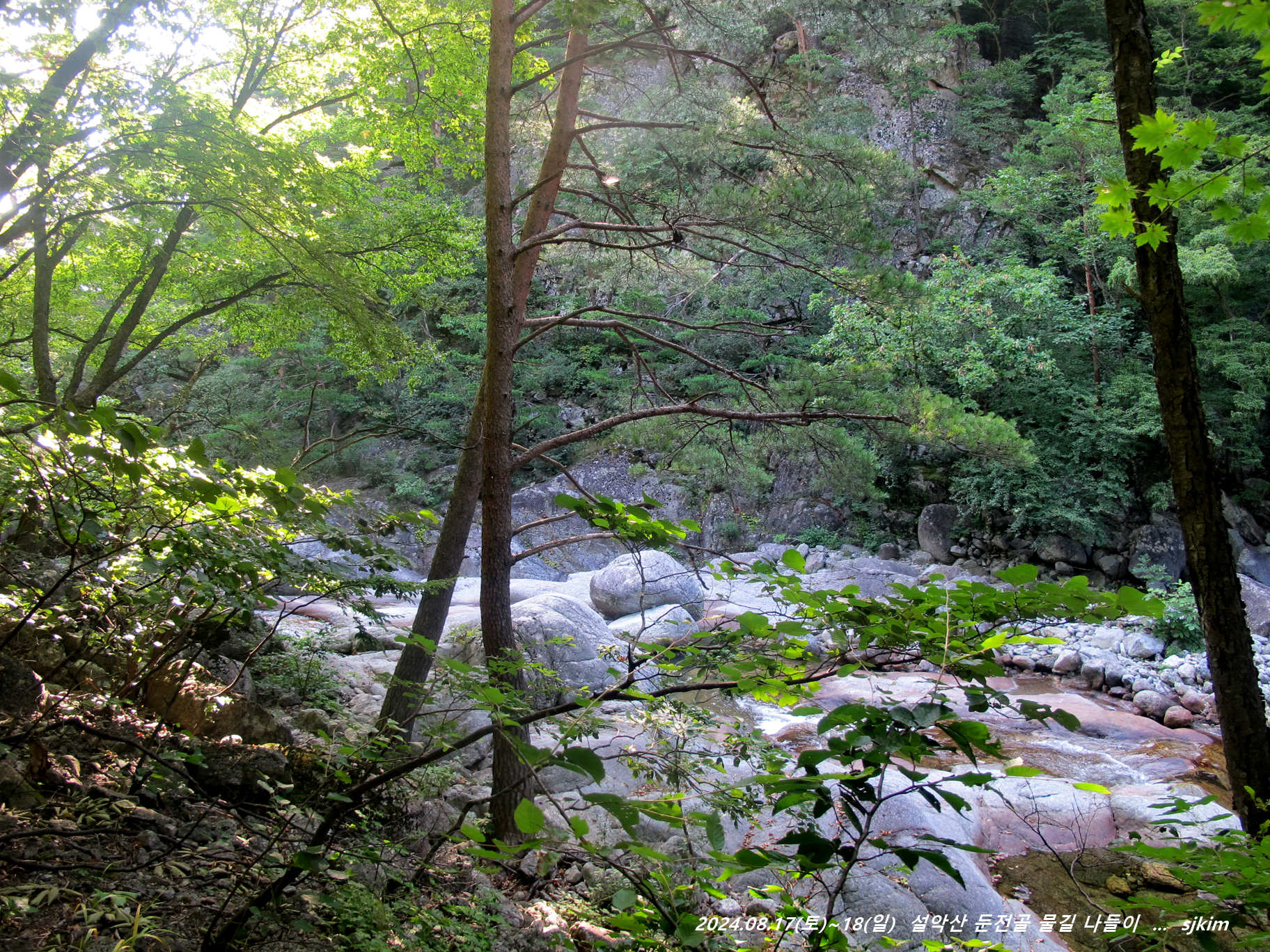 물소리 울리는 통 암반 계류, 반석과 소나무 그늘 좋은 신선대. 14:58