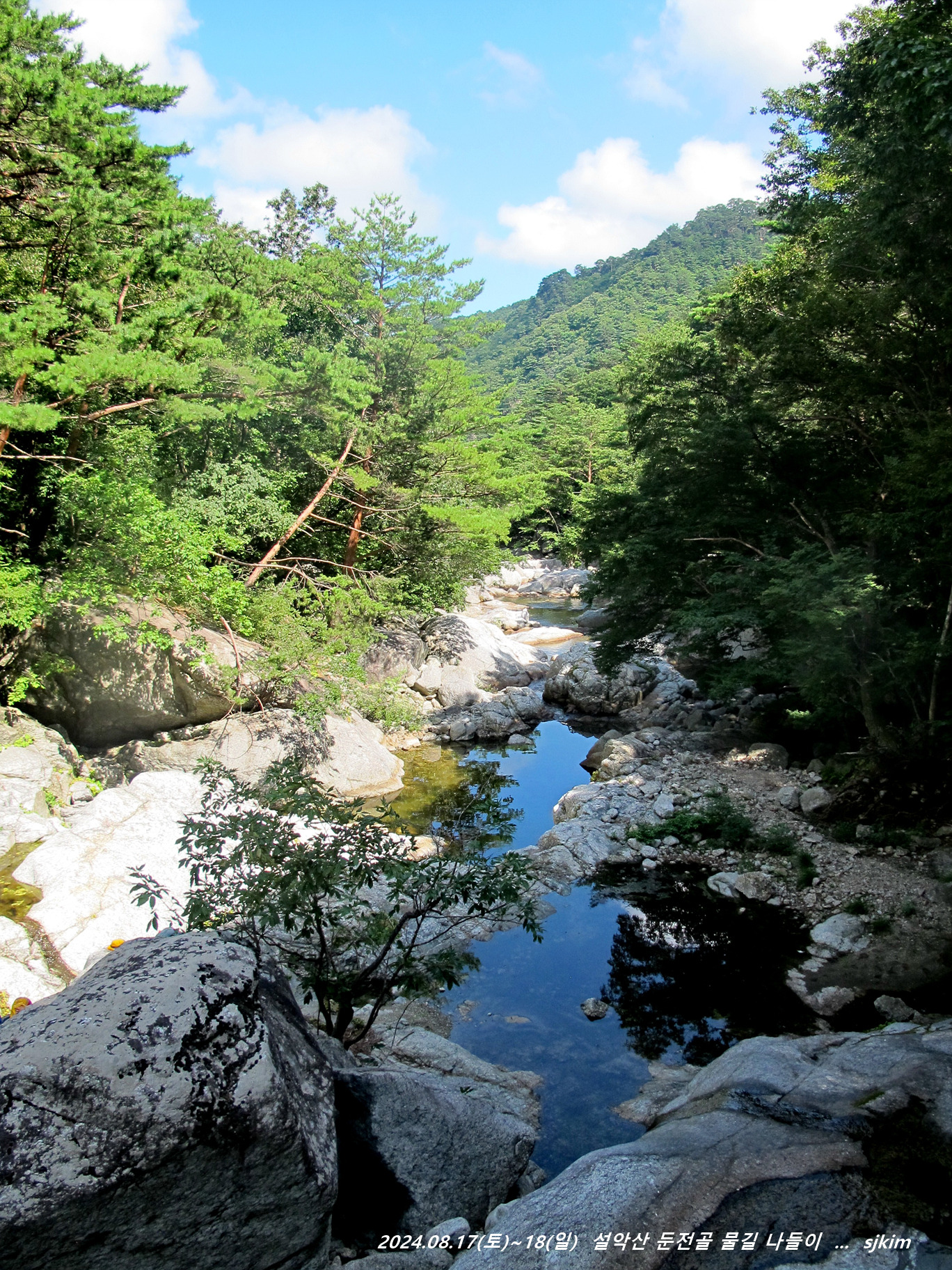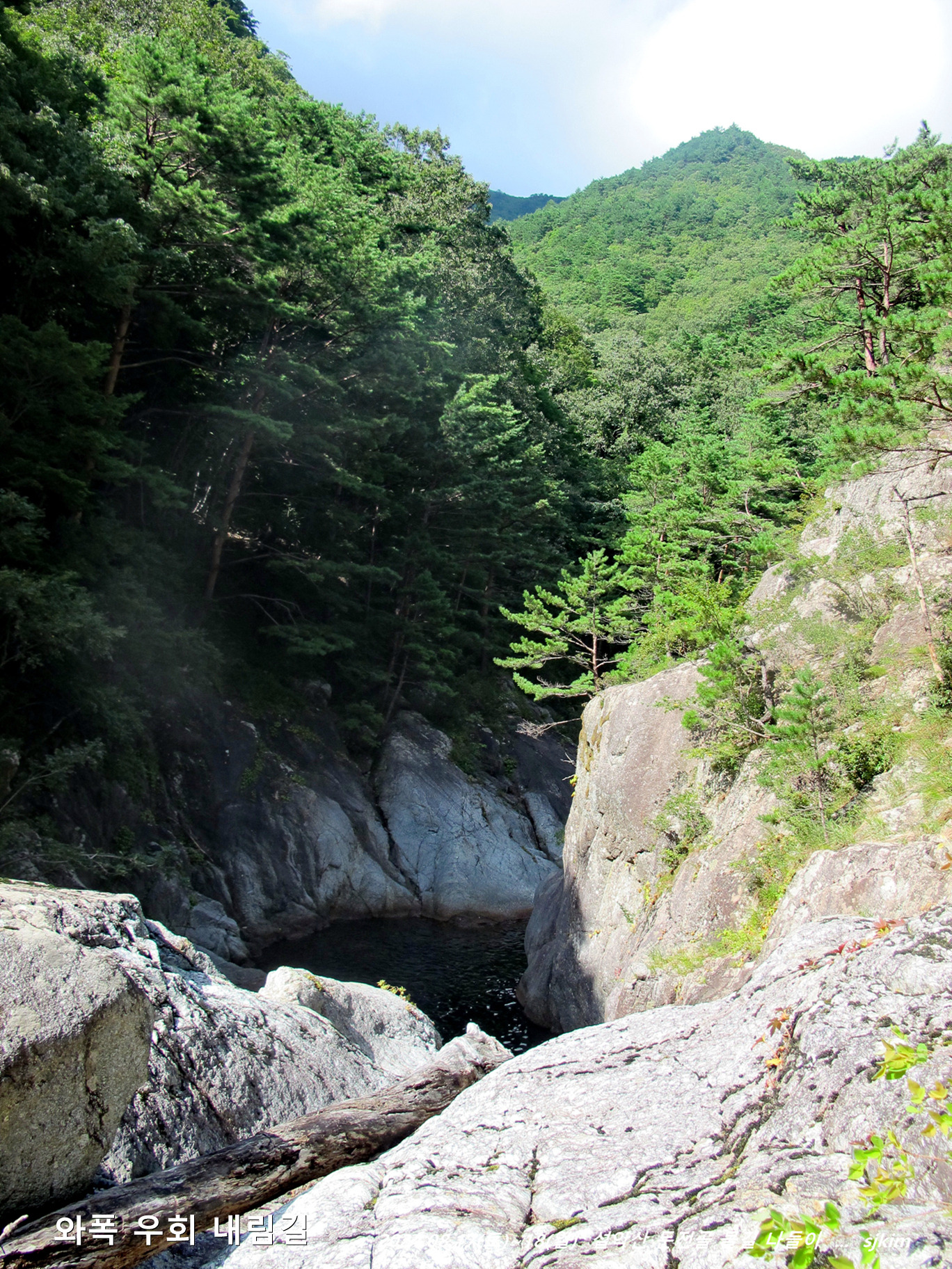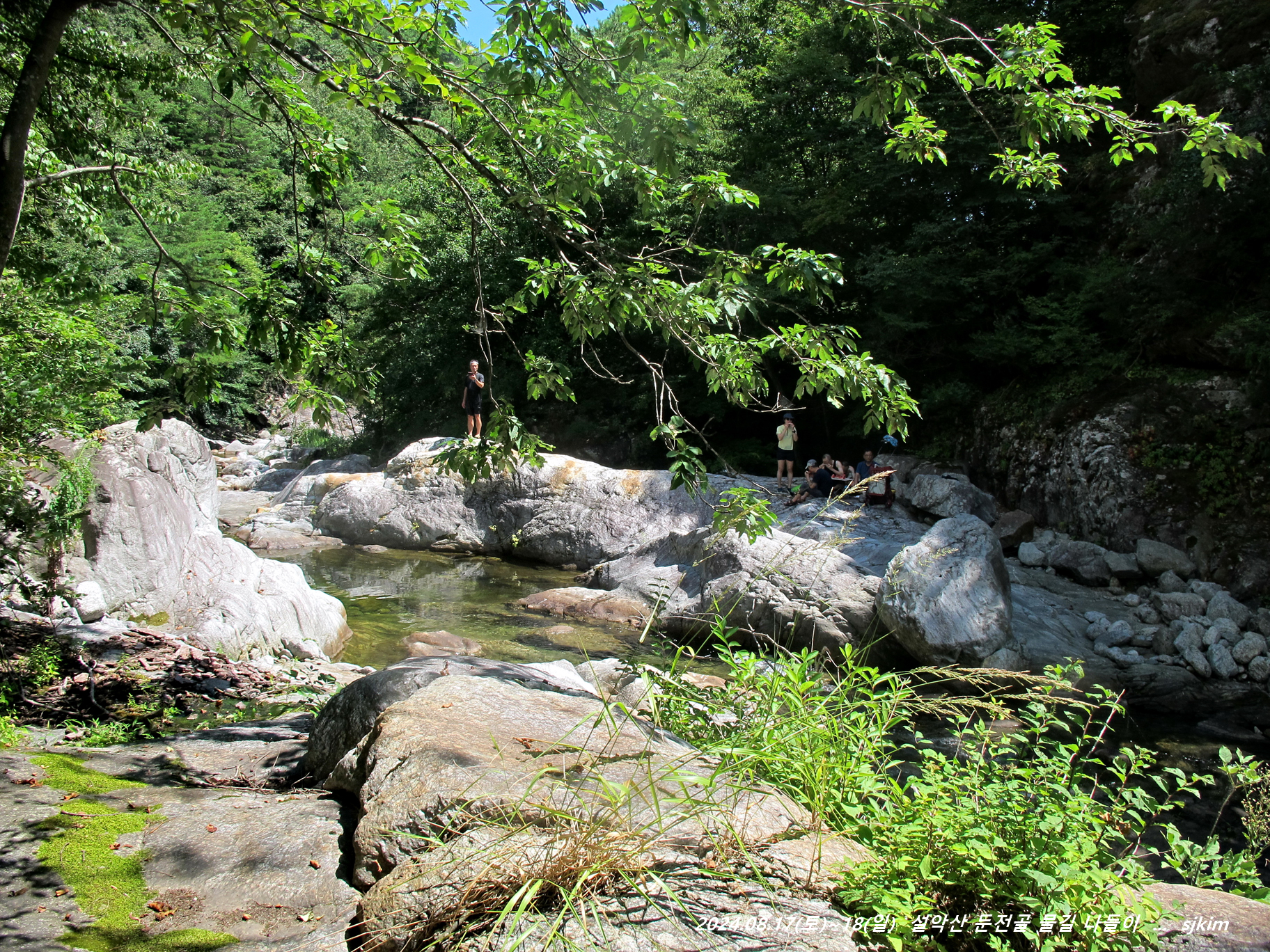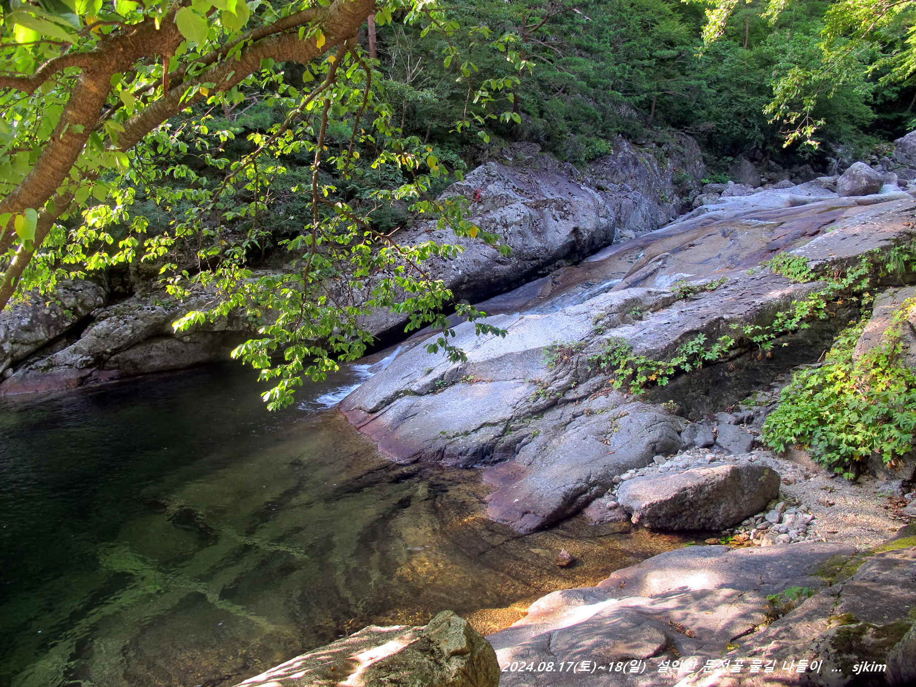 물소리 울리는 통 암반 계류, 반석과 소나무 그늘 좋은 신선대. 14:58