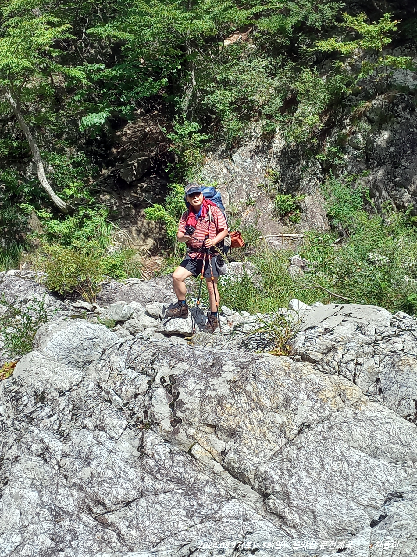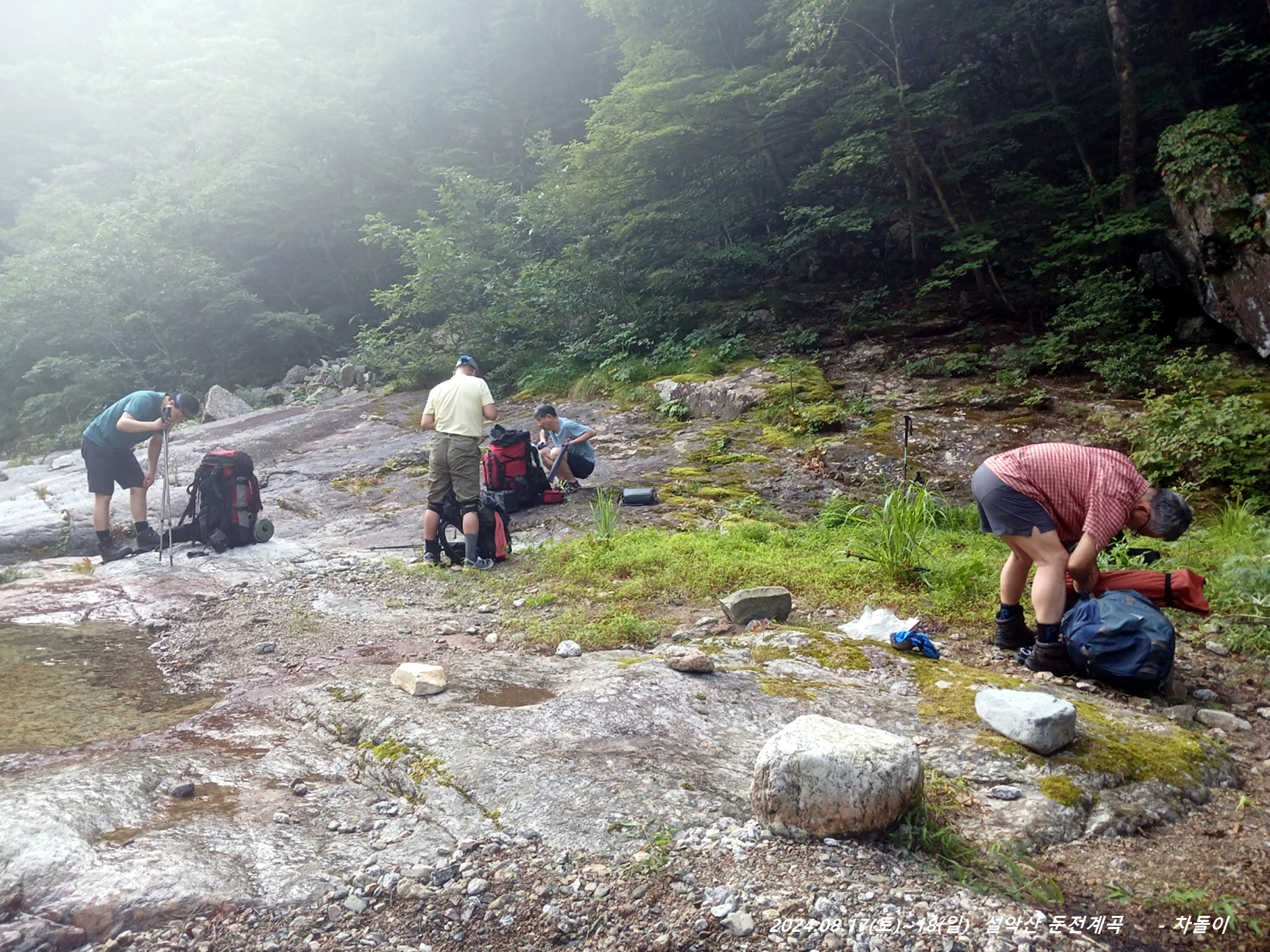 석벽 앞 화전민 터 물나드리 앞에 배낭을 데포하고 경장으로 진행합니다. 08:35