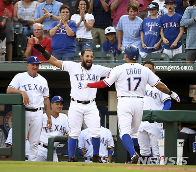 ○··· 【알링턴=AP/뉴시스】 9일(한국시간) 미국 텍사스주 알링턴의 글로브 라이프 파크에서 열린 휴스턴 애스트로스와의 경기에서 1회말 선두타자 홈런을 때려낸 후 동료와 기쁨을 나누는 텍사스 레인저스의 추신수(사진 가장 오른쪽).