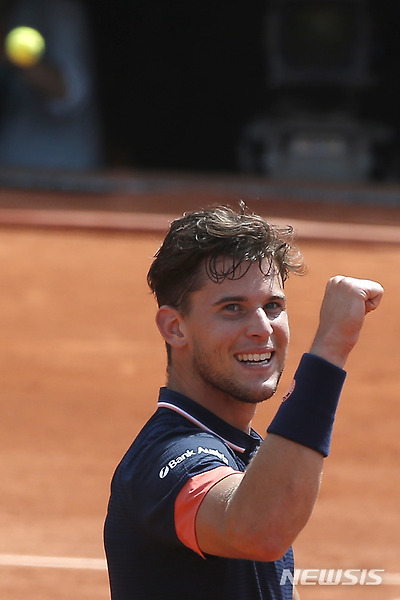 ○··· 【파리=AP/뉴시스】 도미니크 팀이 8일(현지시간) 프랑스 파리에서 열린 프랑스오픈 테니스대회 남자 단식 준결승에서 마르코 체키나토를 꺾은 뒤 기뻐하고 있다.