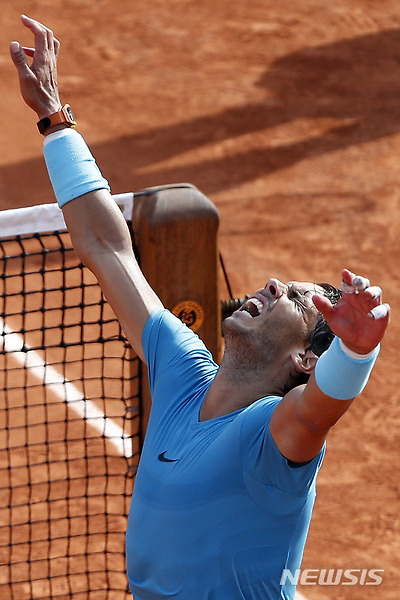 ○··· 【파리=AP/뉴시스】 라파엘 나달이 8일(현지시간) 프랑스 파리에서 열린 프랑스오픈 테니스대회 남자 단식 준결승에서 후안 마르틴 델 포트로를 꺾은 뒤 기뻐하고 있다.