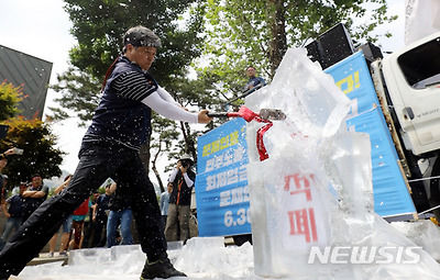 ○··· 【서울=뉴시스】임태훈 기자 = 9일 오후 서울 청와대 사랑채 앞에서 열린 최저임금삭감법 폐기 문재인 정부 규탄 결의대회에서 참석자들이 최저임금 삭감법 폐기를 촉구하며 얼음을 깨는 퍼포먼스를 하고 있다.