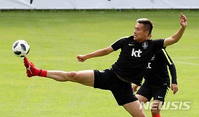 ○··· 【레오강(오스트리아)=뉴시스】고범준 기자 = 2018 러시아월드컵에 출전하는 한국 축구대표팀 김신욱이 9일(현지시간) 오전 전지훈련 캠프인 오스트리아 레오강 스타인베르그 스타디온에서 훈련을 하고 있다.