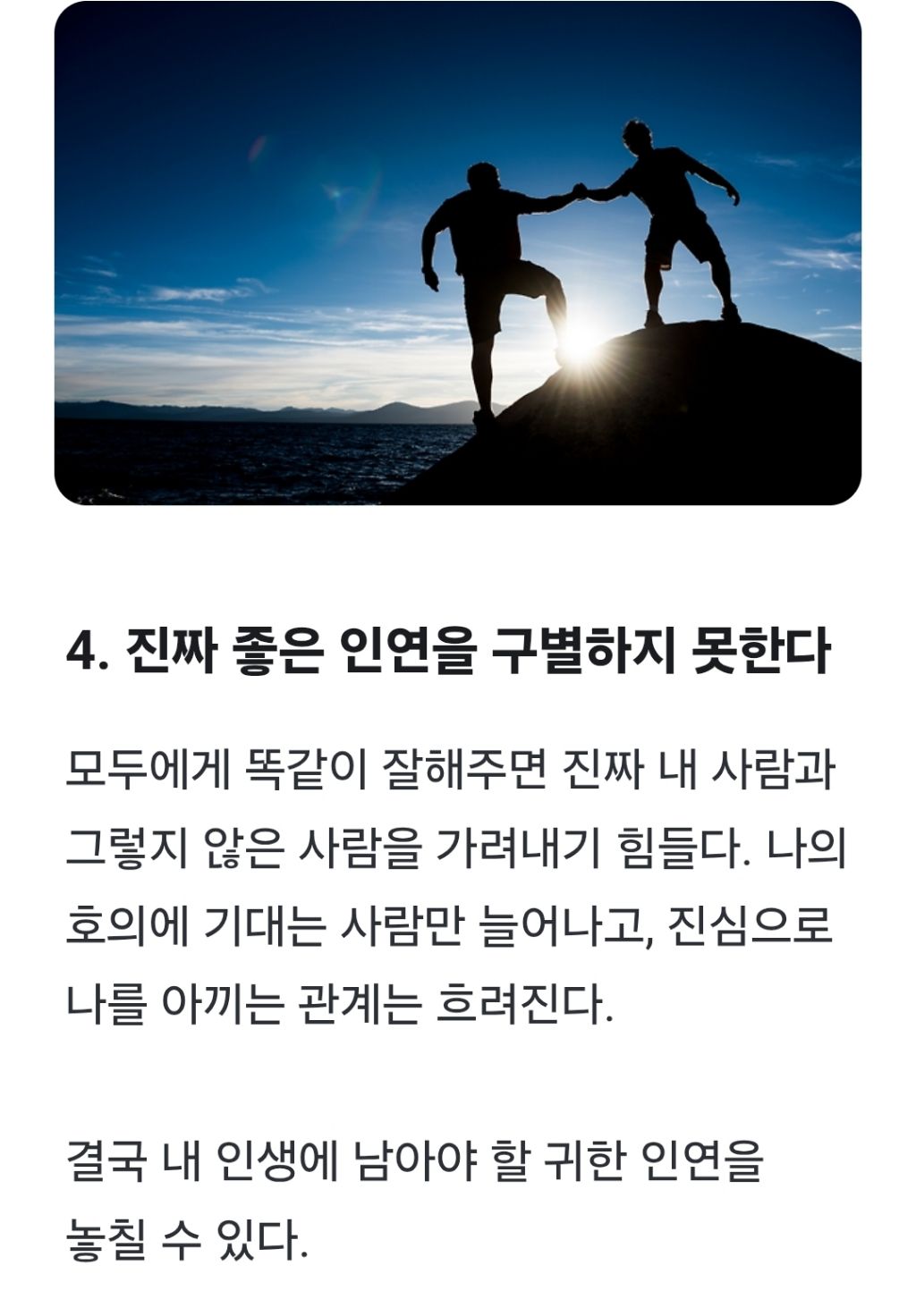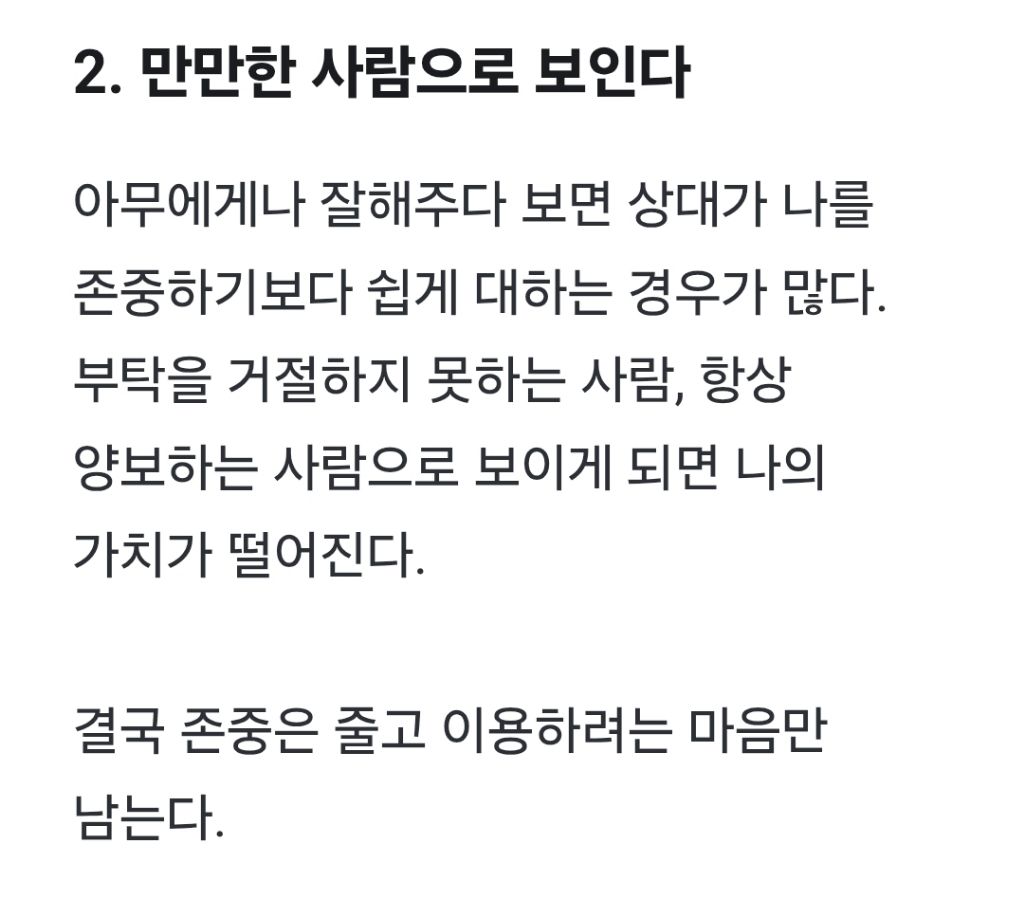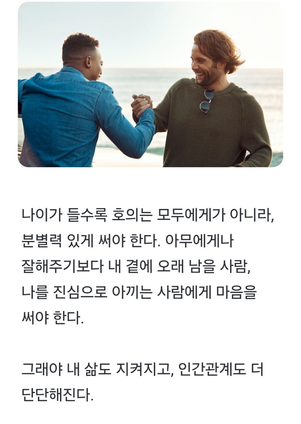 나이들수록 아무에게나 잘해주면 안 되는 이유 4 작성자소래남|작성시간25.10.07|조회수157 목록 댓글 2 글자크기 작게가 글자크기 크게가 다음검색 현재 게시글 추가 기능 열기 북마크 공유하기 신고 센터로 신고 댓글 댓글 2 댓글쓰기 답글쓰기 댓글 리스트 작성자동트는아침 | 작성시간 25.10.07 좋은글 감사 합니다 답댓글 작성자소래남 작성자 본인 여부 작성자 | 작성시간 25.10.08 고맙습니다 건강한 연휴 되시구요 댓글 전체보기