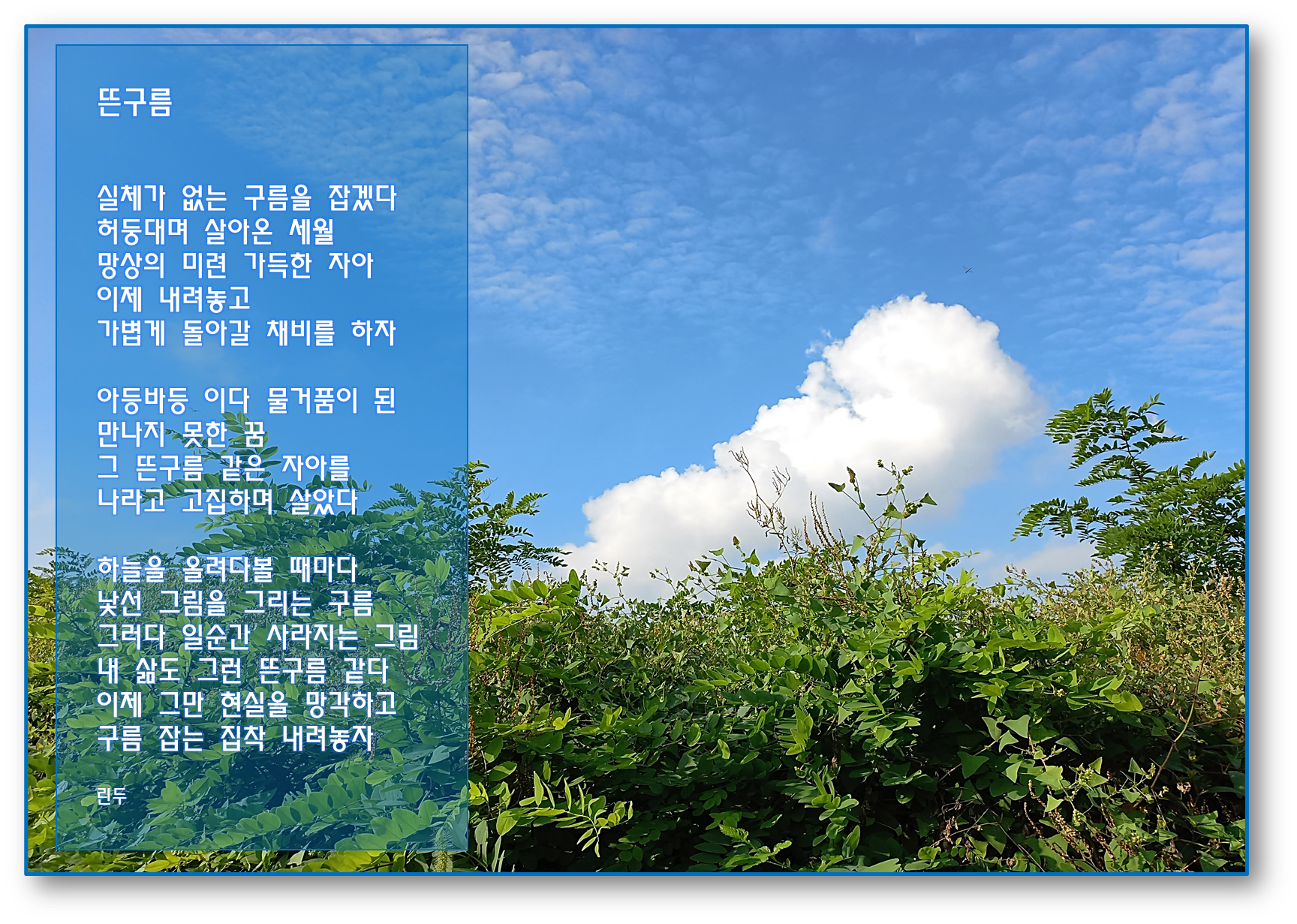 작성자송천(김삼호) 작성시간 24.10.01 아름다운 시 '뜬구름' 감상 잘하고 갑니다.