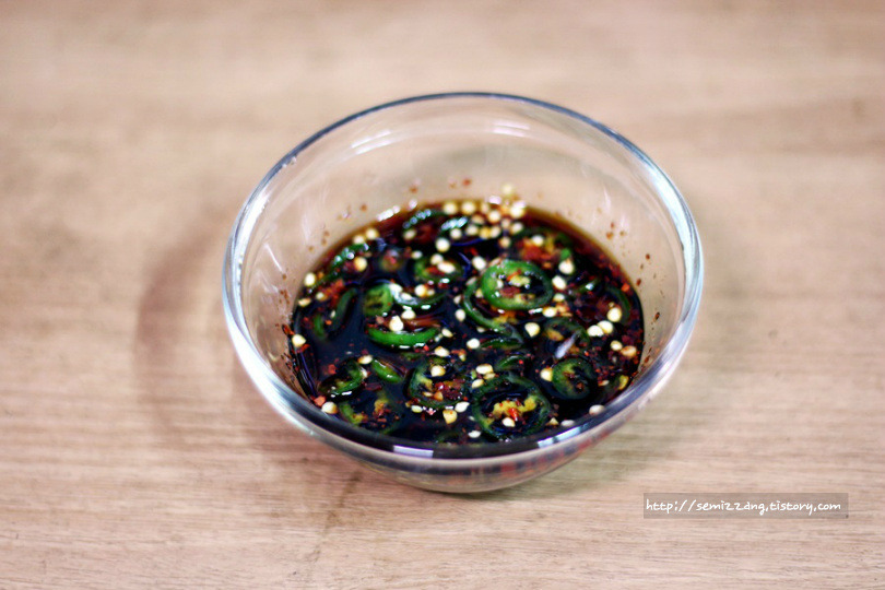 양념간장 : 풋고추2개(or청양고추), 간장4T, 고춧가루1T, 맛술2T, 참기름1T