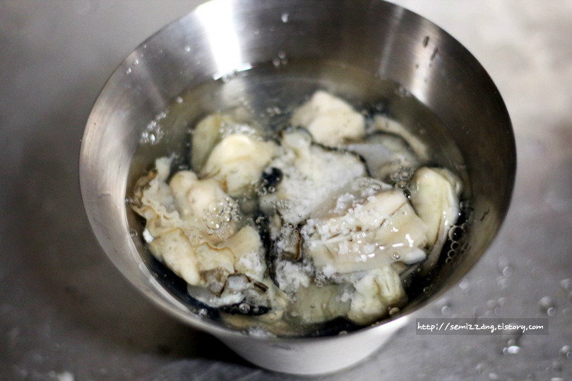 3. 물에 소금을 조금 풀어서 굴을 10분정도 담가놓았다가 흔들어서 씻어주세요.