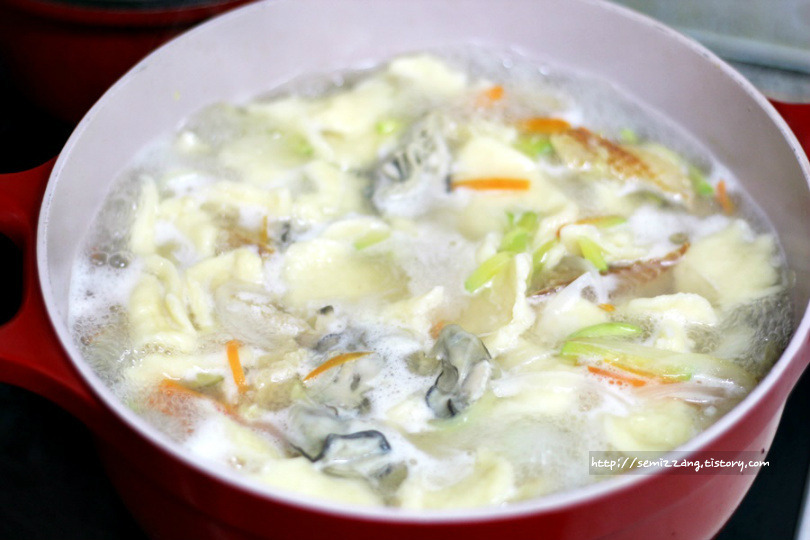 굴을 넣어 시원하고 뽀얀 국물에 쫄깃한 수제비를 넣어 굴수제비를 끓였어요.