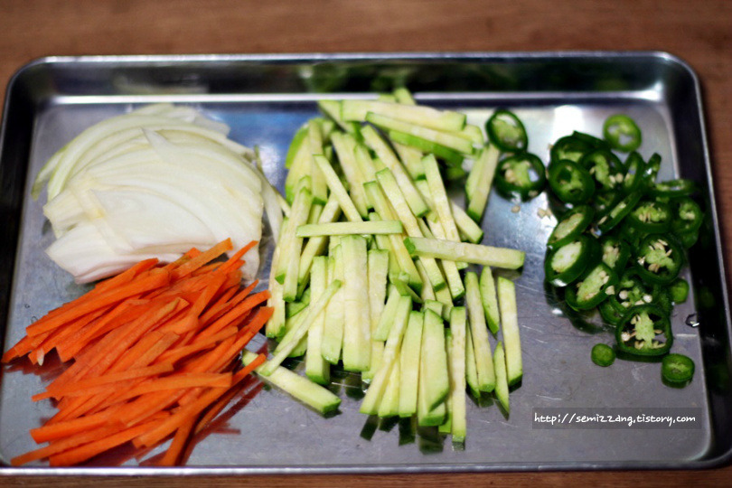 4. 양파, 당근, 호박은 채썰고 고추는 송송 썰어주세요.