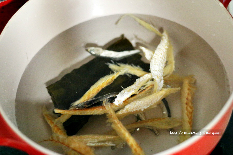 1. 냄비에 물을 붓고 다시마, 멸치, 황태를 넣어 끓여주세요.