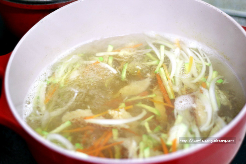 5. 육수가 끓으면 멸치는 건져내고 양파, 당근, 호박을 넣어 끓여주세요.