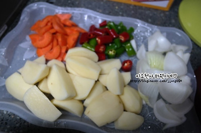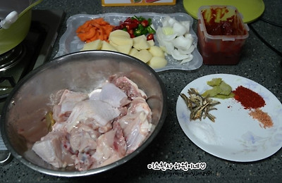 재료 : 닭 한마리, 감자, 당근, 청량고추, 홍고추, 양파, 다진마늘, 소금, 설탕, 고춧가루, 진간장, 미림, 연두
