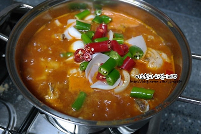 왠만큼 끓었음 고추장과 양념에 쓰이는 각종 재료들을 넣어요~