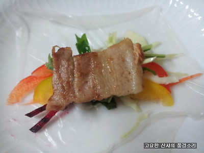 ㉢ 월남쌈에 각종 채소와 삼겹살을 올려준다.