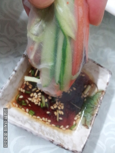 ㉣ 월남쌈에 각종 채소를 담고 돌돌 말아 간장 소스에 찍어 먹는다.