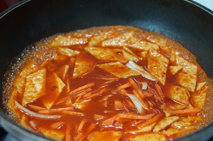 끓어 오르면 마늘, 미림을 넣고 어묵, 당근과 마늘을 넣고 3분간 더 끓여주세요