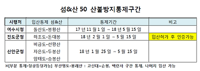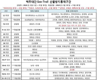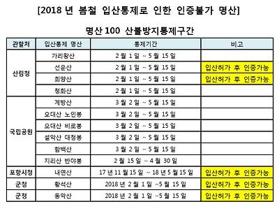 2018년 봄철 『산불방지입산통제구간』에 관련하여 산우님 여러분께 사전 공지 드립니다. 산불은 대부분 사소한 부주의로 발생되기 때문에 국립공원과 산림청에서는 이를 예방하고자 산불이 자주 발생되는 시기에 일부 산행지의 입산을 통제하고 있습니다. 우리의 소중한 산림을 지키기 위해서 산우님 여러분들의 적극적인 협조 부탁 드립니다. 산불방지입산통제 구간은 산림청과, 국립공원을 통해 확인을 하였습니다. 단, 지자체 통제구간인 경우 지역별로 내용이 상이한 경우가 있어 확인에 어려움이 있습니다. 산행에 앞서 지자체에 최종확인 후 출입하시기 바랍니다. 2018년 봄철 입산통제구간은 아래와 같습니다.