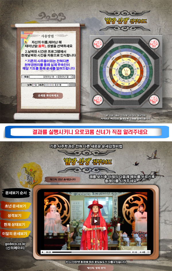 이건 그쪽의 말을 빌리면 신점 프로그램이라고 하는데 자신의 태어난 해와 태어난 달만 알면 현재의 기운과 현재의 시간의 기운을 조합하여 자신의 상황과 성격 및 현재 상황을 알려주고 미래에 대해 예견해주네요