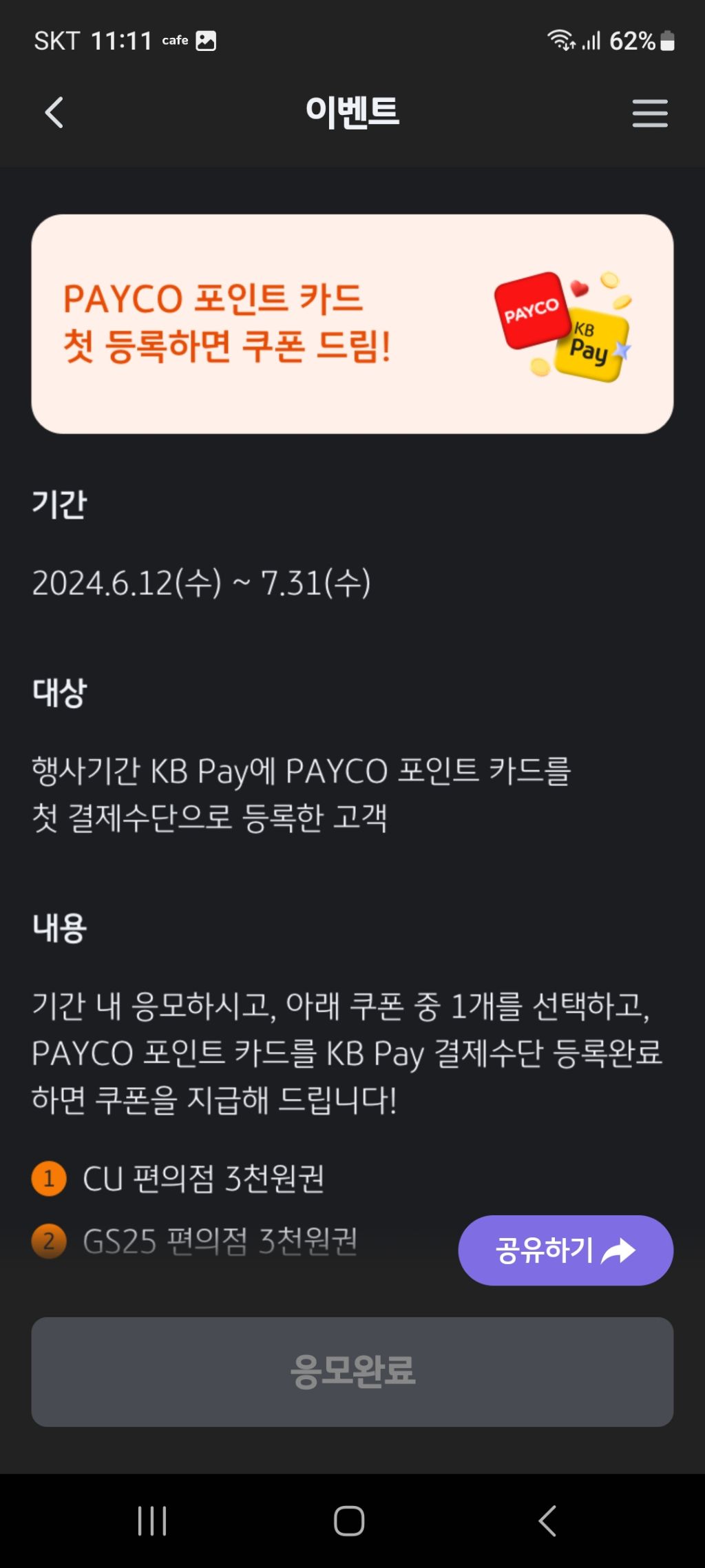 KB Pay ,페이코 포인트 카드 첫등록(~7.31) 작성자나도쫌|작성시간24.06.12|조회수326 목록 댓글 0 글자크기 작게가 글자크기 크게가 KB PayPAYCO 포인트 카드 첫 등록하면 쿠폰 드림!webpay.kbcard.com 다음검색 현재 게시글 추가 기능 열기 북마크 공유하기 신고 센터로 신고 댓글 댓글 0 댓글쓰기 답글쓰기 댓글 리스트