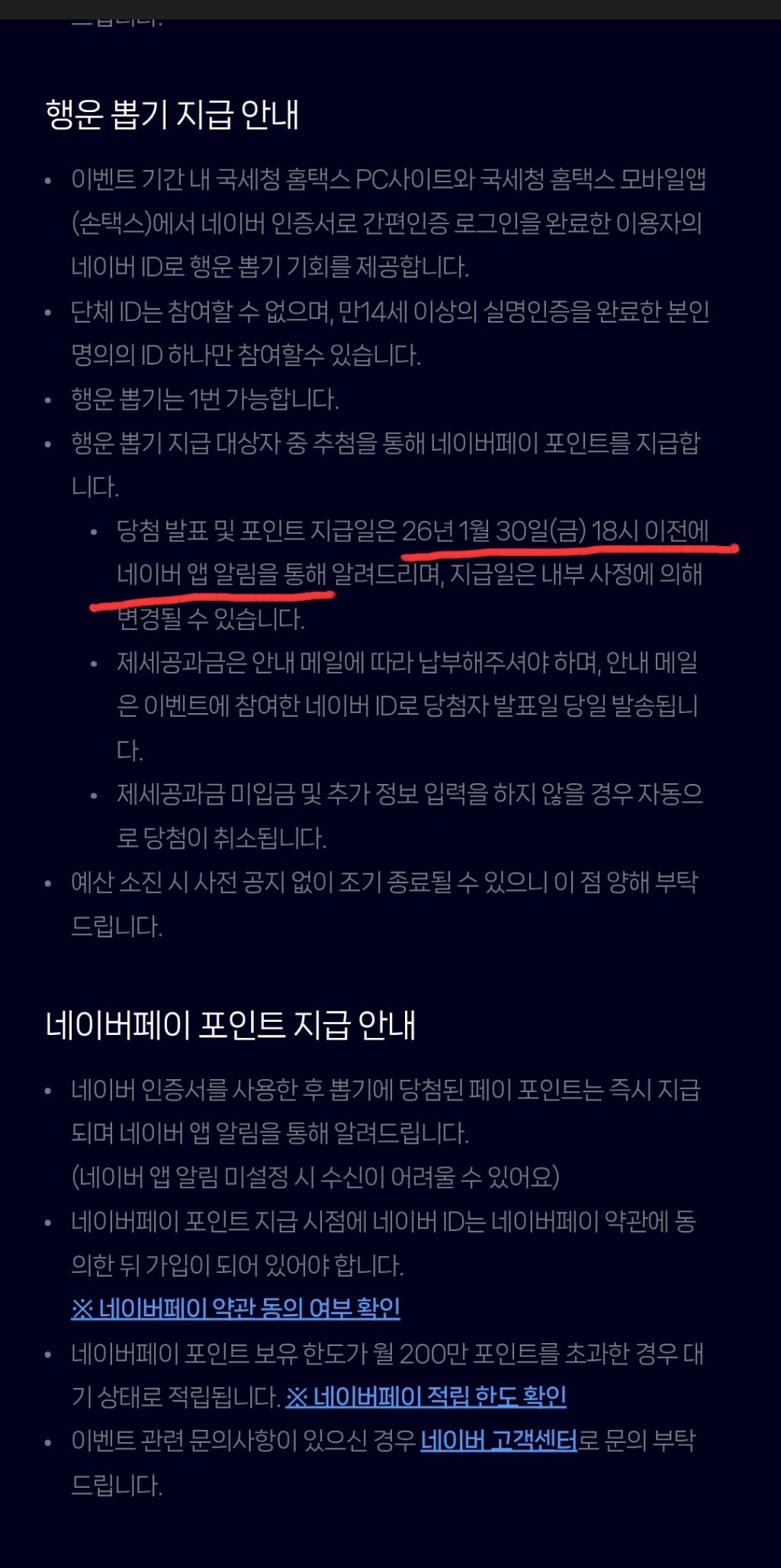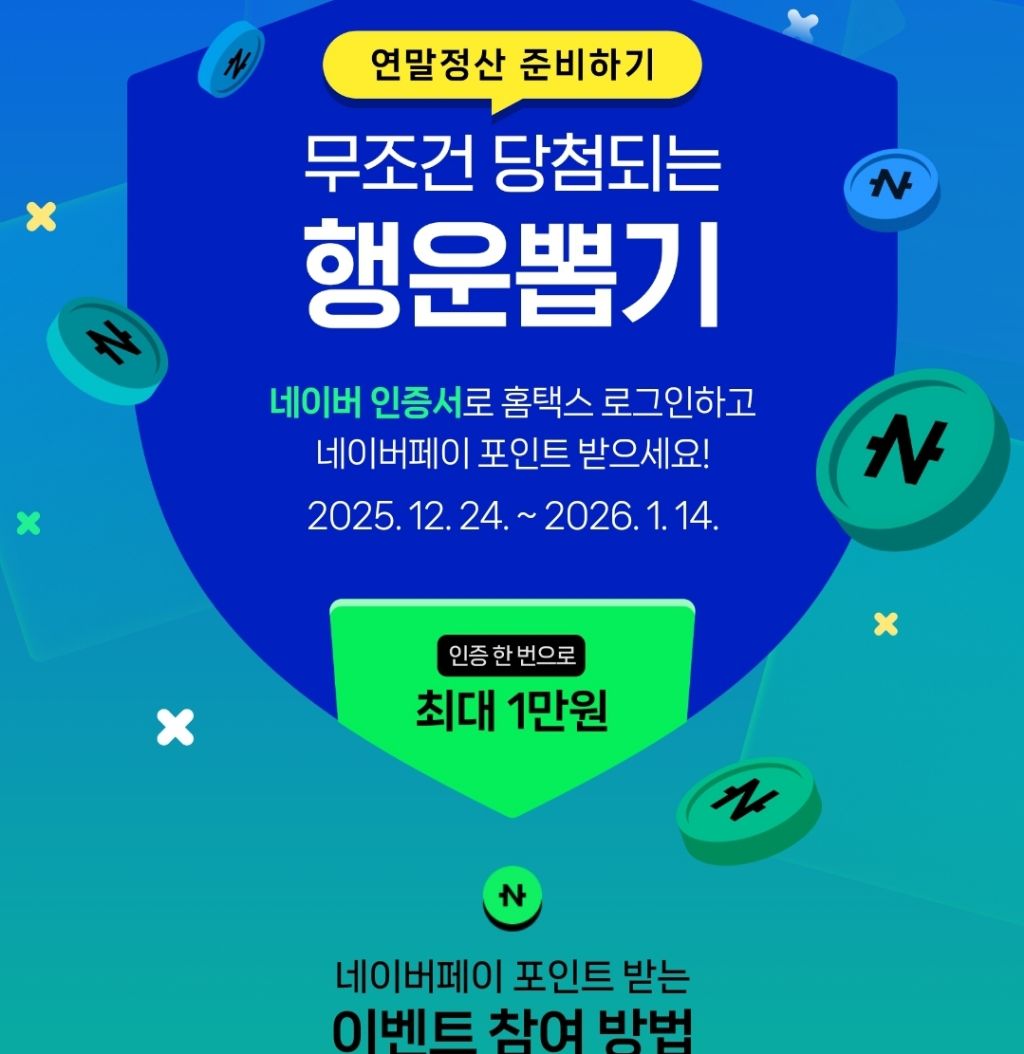 네이버인증서로 홈택스 로그인하고 네이버페이 포인트 받기(~1.14) 작성자나도쫌|작성시간25.12.24|조회수176 목록 댓글 3 글자크기 작게가 글자크기 크게가 네이버 인증서 연말정산 행운뽑기 이벤트여기를 눌러 링크를 확인하세요ekyc.naver.com 다음검색 현재 게시글 추가 기능 열기 북마크 공유하기 신고 센터로 신고 댓글 댓글 3 댓글쓰기 답글쓰기 댓글 리스트 작성자타민 | 작성시간 25.12.24 500원 ㅜㅜ 작성자쿠모니 | 작성시간 25.12.24 감사합니다 ^^ 작성자개구리팔짝팔짝 | 작성시간 25.12.24 감사합니다 3000원 댓글 전체보기