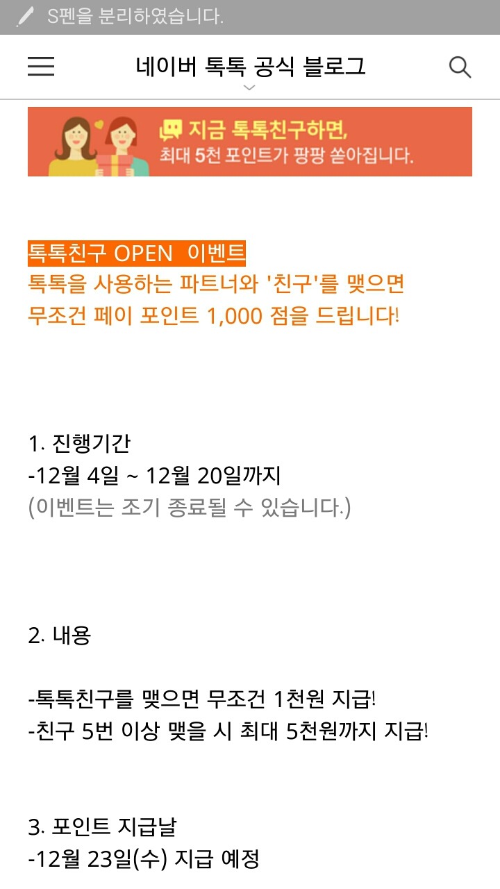 [100%당첨]네이버쇼핑 톡톡친구맺기 최대5000원 네이버페이 포인트지급 이벤트(~12.20) 작성자바니핑크|작성시간15.12.09|조회수2,246 목록 댓글 22 글자크기 작게가 글자크기 크게가 http://m.blog.naver.com/naver_talk/220554685129 다음검색 현재 게시글 추가 기능 열기 북마크 공유하기 신고 센터로 신고 댓글 댓글 22 댓글쓰기 답글쓰기 댓글 리스트 작성자망고빙수 | 작성시간 15.12.10 감사해요! 작성자울규리짱 | 작성시간 15.12.10 감사합니당 작성자예쁜아가야 | 작성시간 15.12.11 완료했어요 감사용^^ 작성자경품초보응모 | 작성시간 15.12.11 감사합니다 완료! 작성자긍정스위치 | 작성시간 15.12.14 감사합니다! 댓글들 보고 친구맺었는데 지급일에 잘 들어오길!^^ 댓글 전체보기