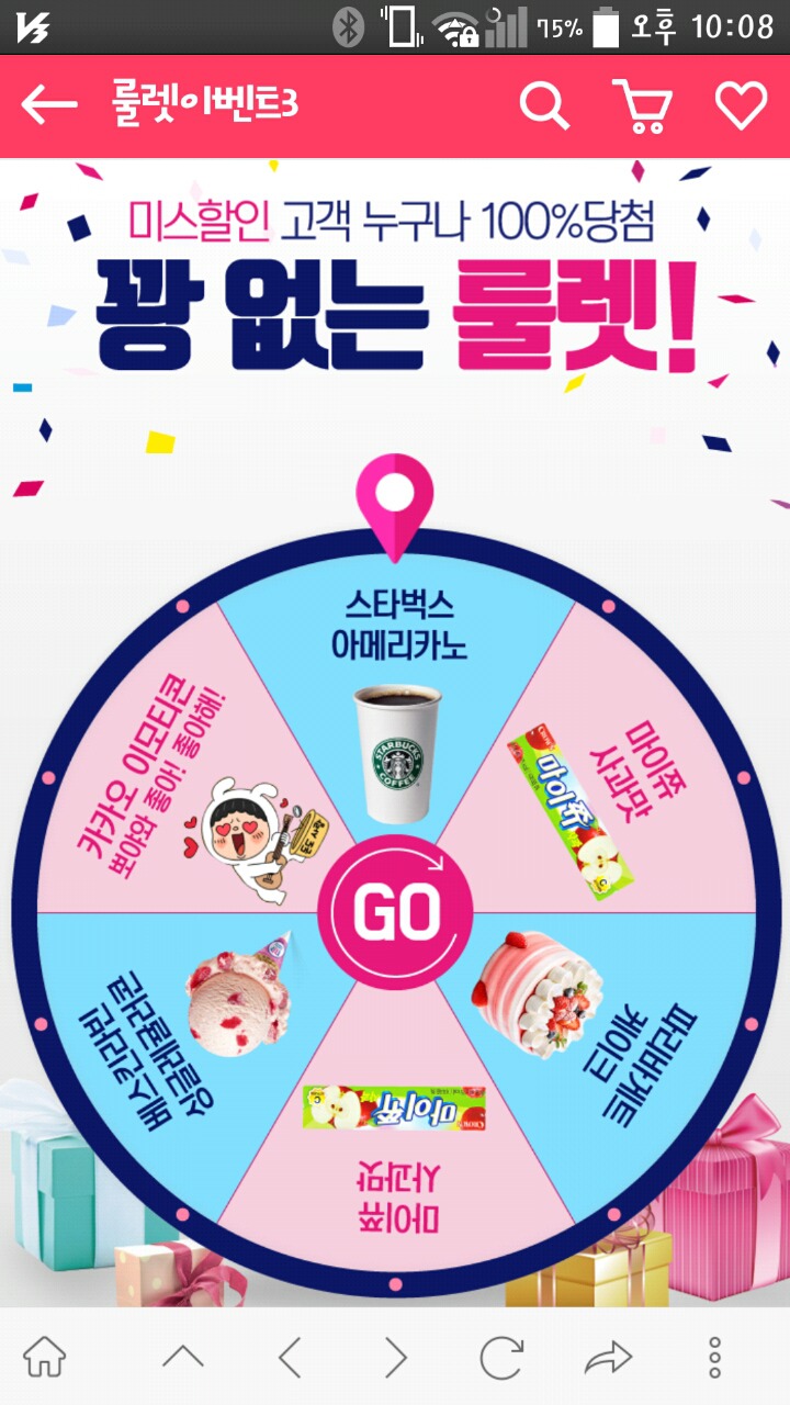 미스할인앱 룰렛이벤트3(~경품소진시까지) 작성자나도쫌|작성시간18.04.14|조회수2,379 목록 댓글 41 글자크기 작게가 글자크기 크게가 http://m.mysdis.co.kr/event/detail/?e_num=19 깔려있으신분들은앱으로바로가지마시고링크타고가셔서 다음이나 네이버로가셔서 앱으로다시들어가셔서 해보세요 다음검색 현재 게시글 추가 기능 열기 북마크 공유하기 신고 센터로 신고 댓글 댓글 41 댓글쓰기 답글쓰기 댓글 리스트 작성자Annie맘 | 작성시간 18.04.16 마이쮸 작성자ssun-up3000 | 작성시간 18.04.16 마이쥬 당첨, 감사합니다~ 작성자예달벙 | 작성시간 18.04.17 저도 마이쭈당첨이요 감사합니다~ 작성자짱구왔다 | 작성시간 18.04.19 마이쭈 감사해요~~^^ 작성자파란하늘_ | 작성시간 18.05.02 감사합니다 댓글 전체보기